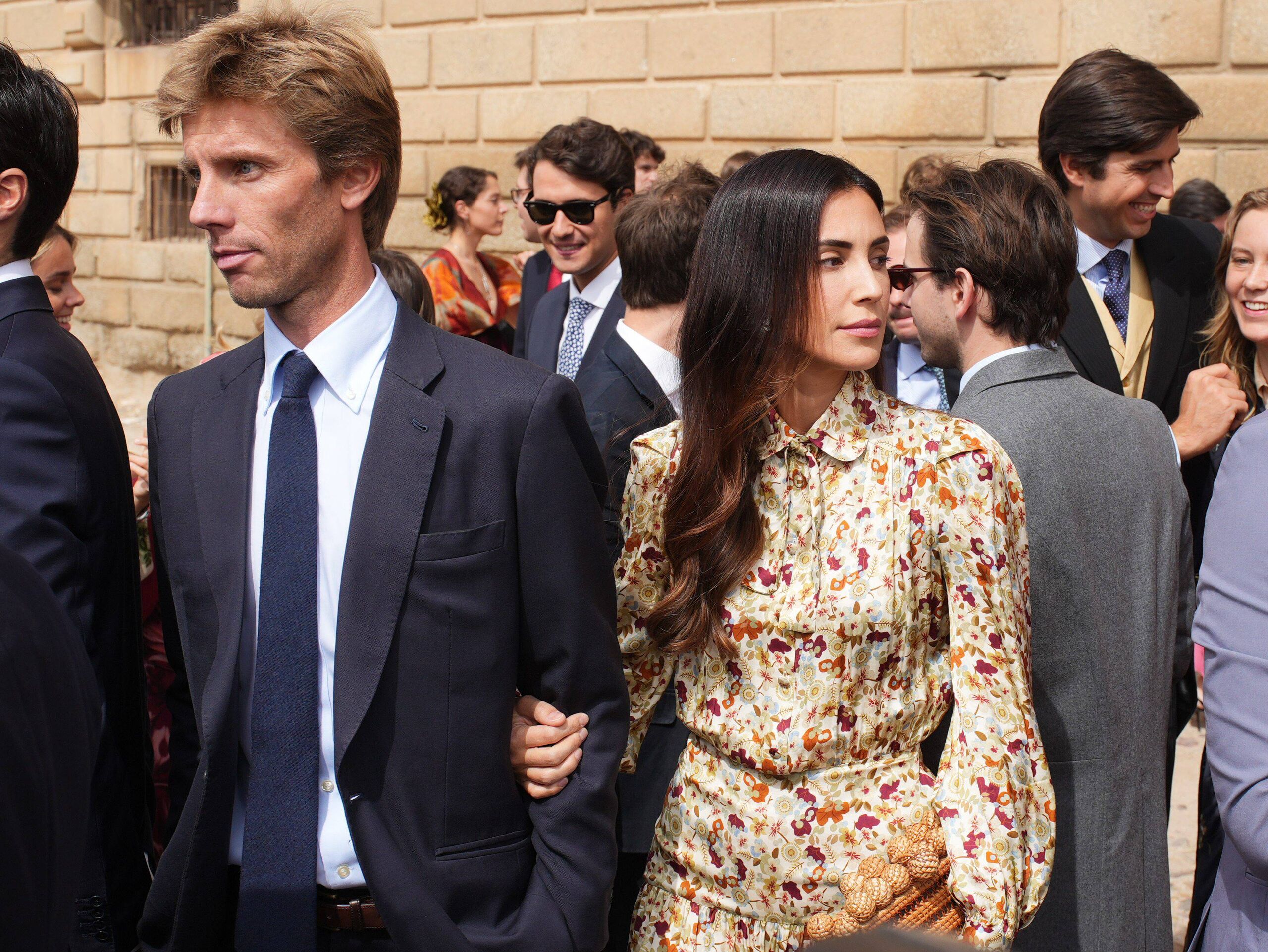 Entre los invitados estaba la mujer con más títulos nobiliarios en España, Victoria de Hohenlohe-Langenburg, duquesa de Medinaceli, acompañada de su marido Maxime Corneille con quien se casó en 2023. La duquesa ha optado por un vestido midi estampado con motivos vegetales de colores y volante ancho en la falda y lentejuelas.