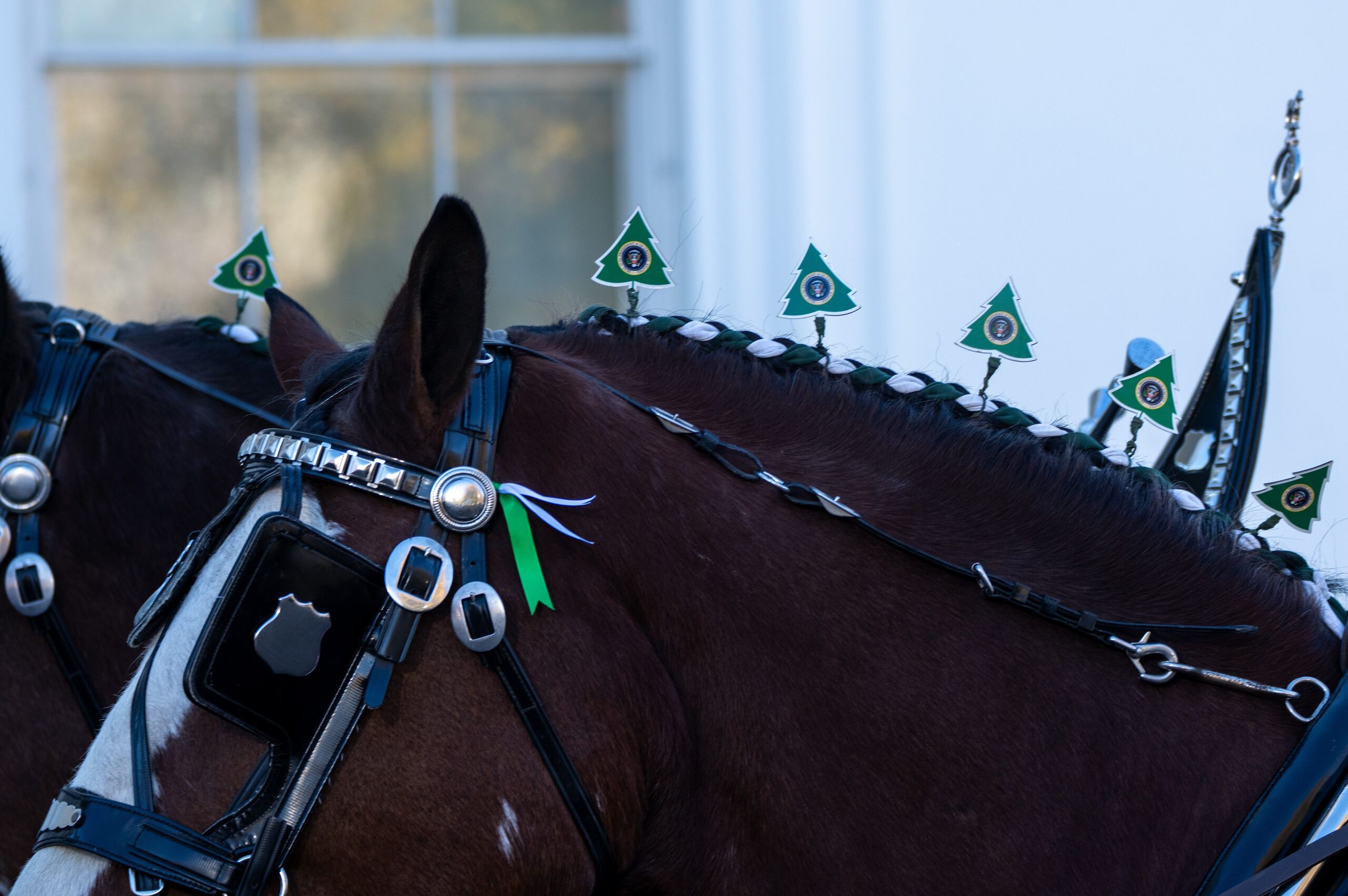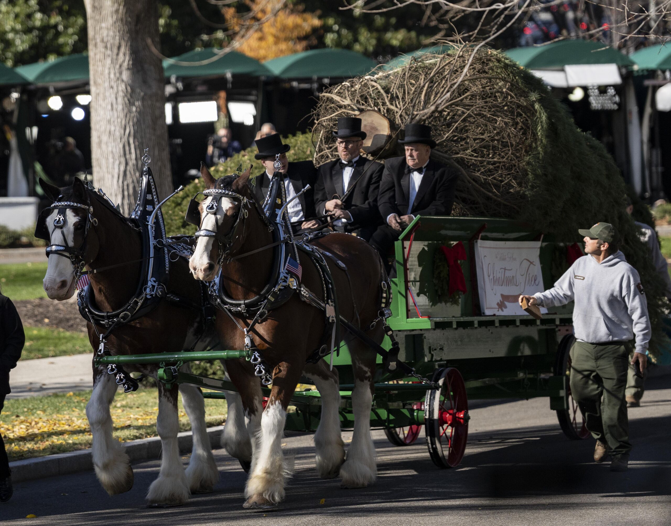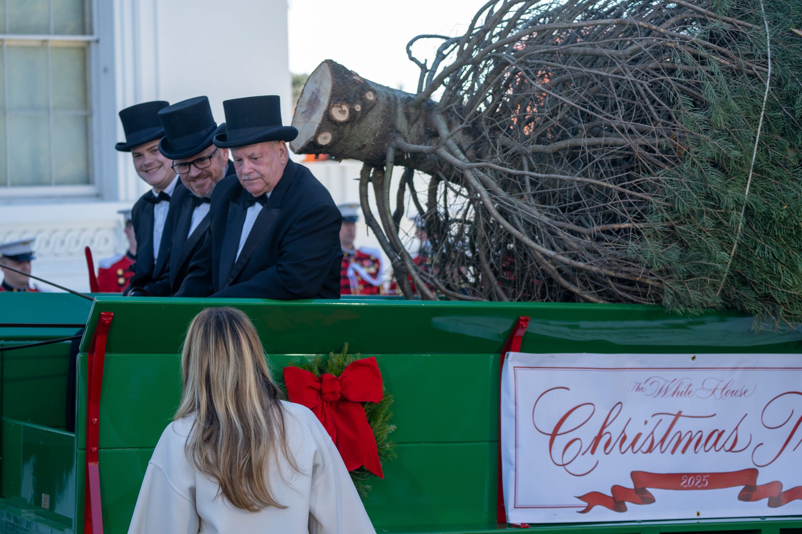 Para recibirlo, Melania salió por la entrada principal de la residencia presidencial, tal como dicta la tradición. Allí esperaba el abeto, transportado cuidadosamente en un carro tirado por caballos y guiado por tres conductores vestidos elegantes con esmoquin, lo que aportó al acto un aire solemne y festivo.