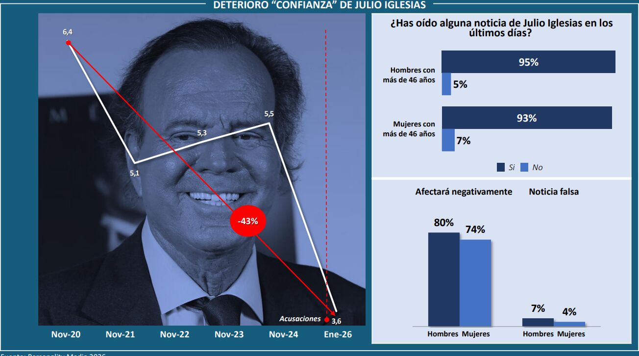 La imagen de Julio Iglesias se está deteriorando a pasos agigantados. Un estudio realizado por "Personality Media", consultora especializada en el análisis de personajes públicos, confirma el gran impacto negativo que ha tenido la denuncia por agresión sexual en el cantante.