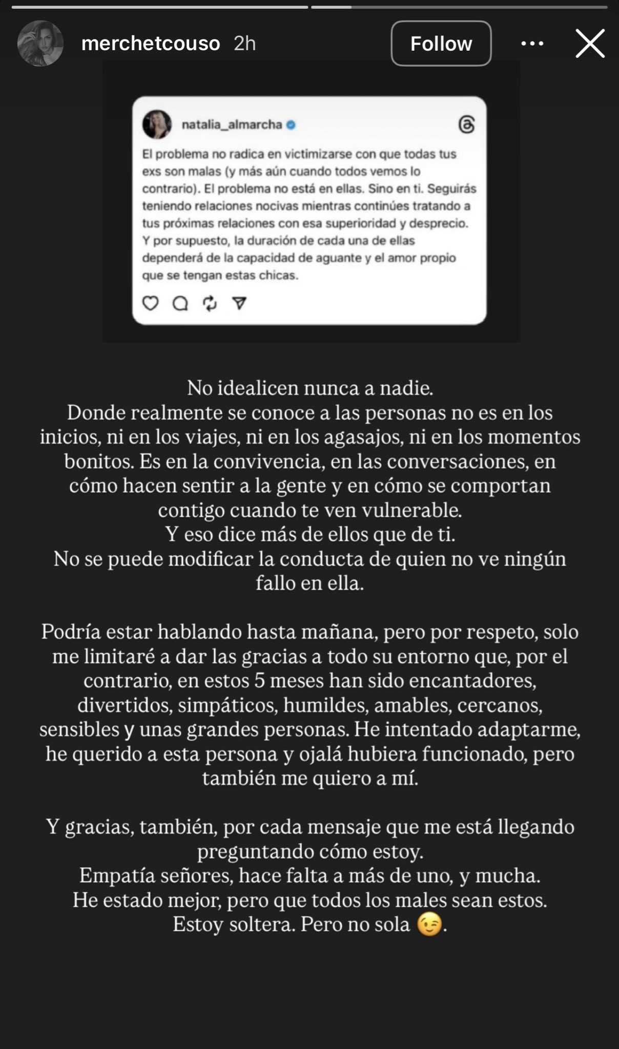 Merche Torre citó el primer mensaje y siguió por la misma línea. "No idealicen nunca a nadie. Donde realmente se conoce a las personas no es en los inicios, ni en los viajes, ni en los agasajos, ni en los momentos bonitos. Es en la convivencia, en las conversaciones, en cómo hacen sentir a la gente y en cómo se comportan contigo cuando te ven más vulnerable. Eso dice más de ellos que de ti", escribió.
