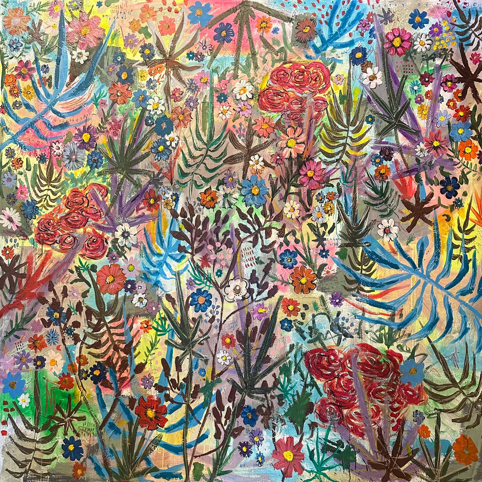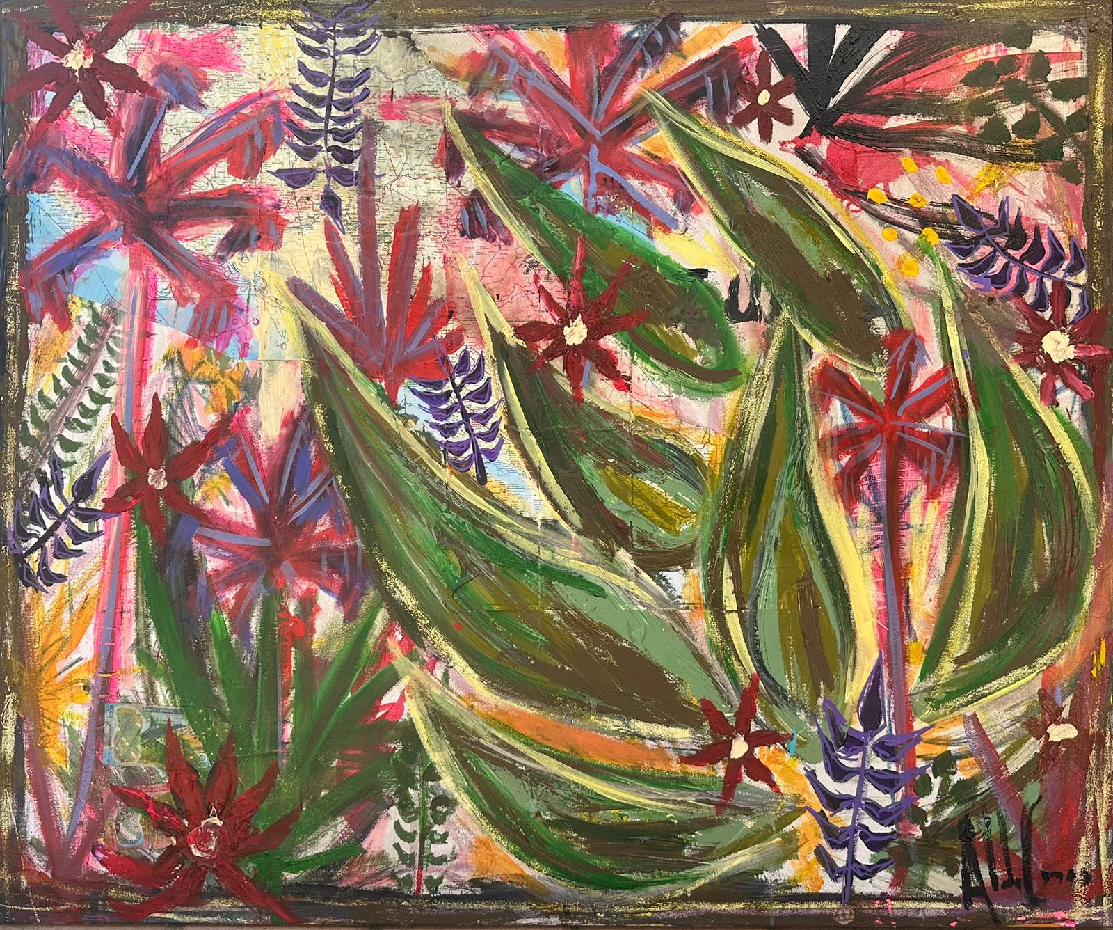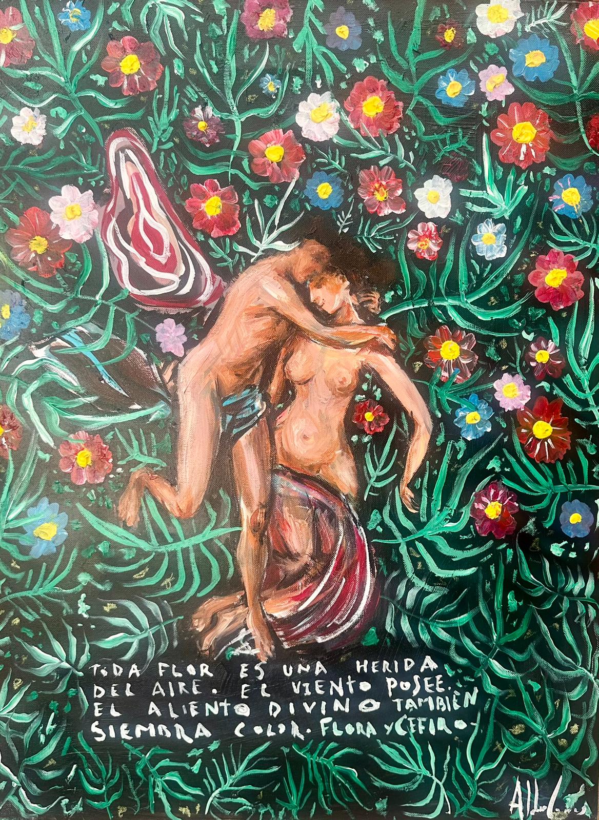 "Es un viaje interno a través de elementos selváticos de la naturaleza, recordando parte de mi infancia. Las etiquetas en el arte son muy complejas. Pinto lo que me sale del alma. La selva es agresiva, salvaje, injusta, van unidas a la naturaleza y al rock and roll. Hice un viaje en un programa de televisión por diferentes países de Sudamérica, 17.000 km en dos meses y medio, fue una locura, y a la vez una experiencia maravillosa y preciosa. Ahí pude ver la naturaleza tal cual. Organizar esta exposición me ha llevado un tiempo, desde octubre llevo pintando entre 8 y 9 horas diarias, y ocupándome de mi hijo, porque Macarena Gómez no para de viajar por su trabajo, esta situación siempre ha sido así y lo tenemos muy claro. A pesar de lo que me critican, soy el más chacho de todos. Nos encanta vivir en mitad de la naturaleza, y hay que comprenderla, y la entiendes cuando se deja conocer. Yo no podría vivir en una ciudad, las casas son como colmenas". Así me lo explicó a lo largo de nuestra conversación.