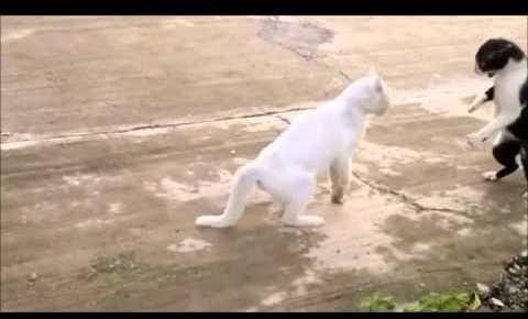 Durante una pelea de gatos, uno de los felinos se levanta en sus dos patas con una pose que recuerda a la del legendario maestro de las artes marciales, Bruce Lee.