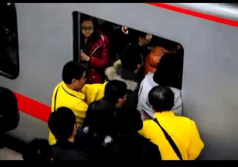 Un jóven que intenta salir en su parada es empujado de nuevo al interior del vagón por la gran afluencia de gente, durante la hora punta en el metro de Pekín.