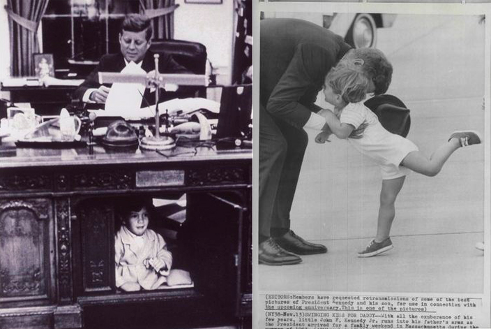 La relación del pequeño John John con su padre fue retratada minuto a minuto por los fotógrafos oficiales que luego difundían las imágenes. El presidente Kennedy transmitía la idea de familia ideal. A todo el mundo le encantó que el pequeño jugara a los pies de su padre en el despacho oval.