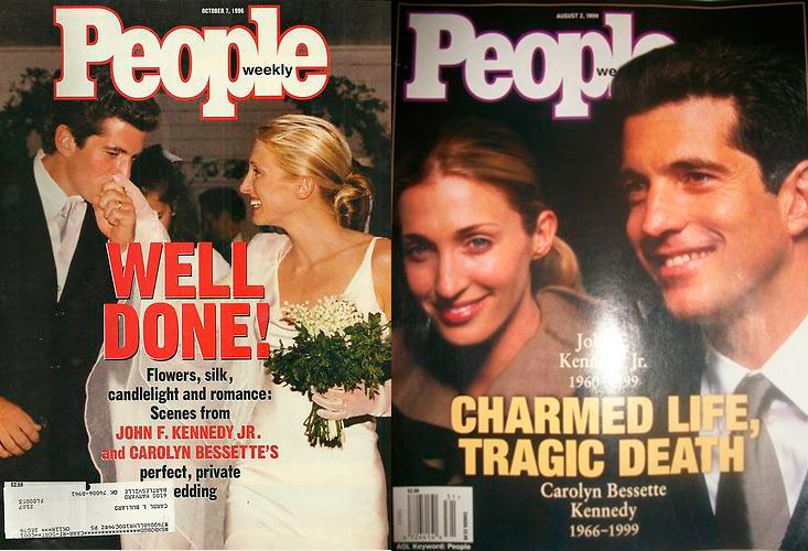 Apenas tres años separan estas dos portadas. En 1996 John John se casaba con Carolyn Besset, convirtiéndose en la pareja favorita de los norteamericanos. Pero en 1999 ambos morían en un accidente. John John conducía el avión privado que desapareció en el mar, aumentando así la leyenda trágica de su familia.