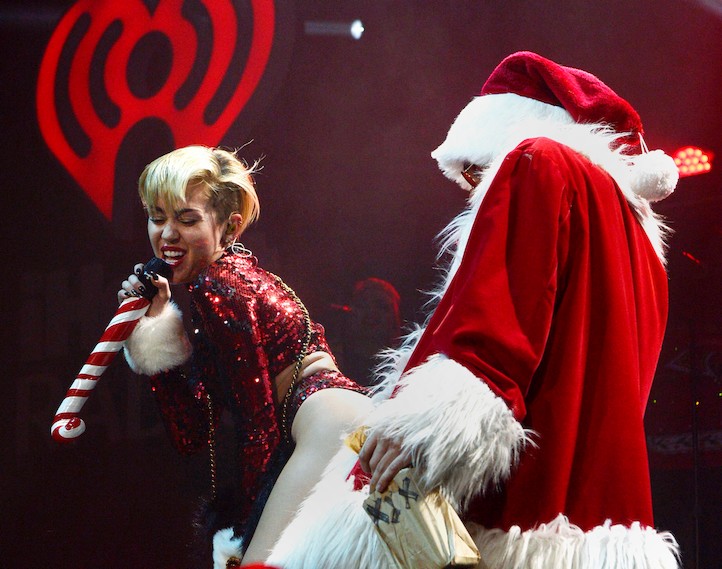 En esta ocasión, su compañero para el movimiento ha sido un Papá Noel que paseaba por detrás de Miley, acompañado de una botella de alcohol que llevaba oculta en una bolsa.