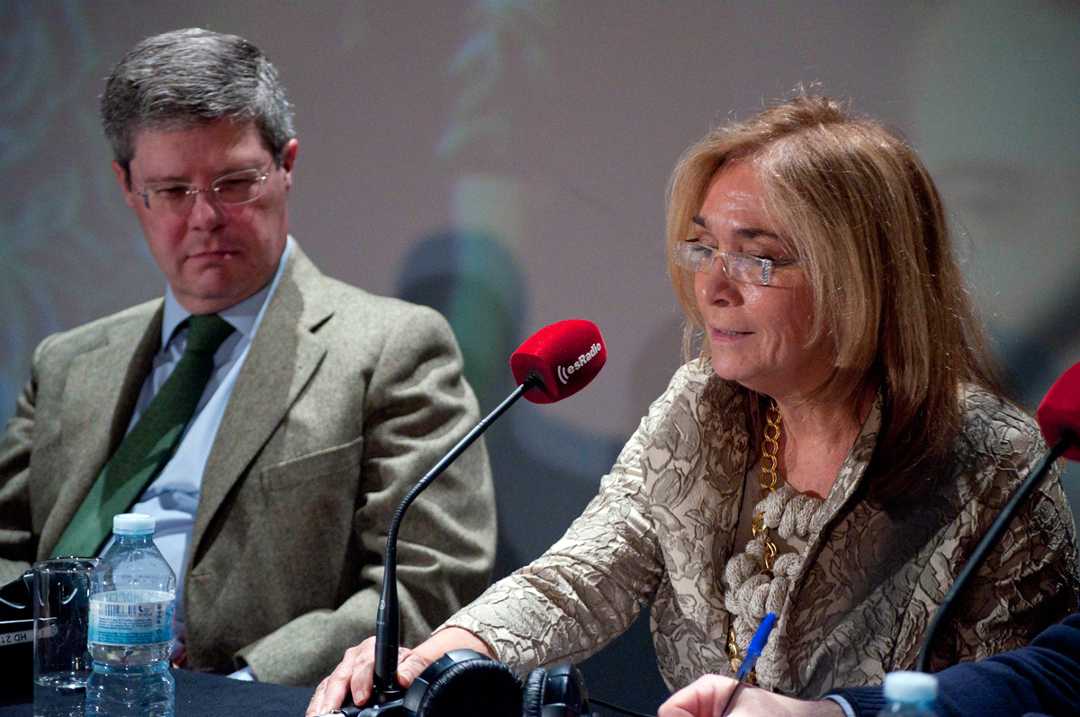 María José Peláez señala a uno de los técnicos. También en la mesa Cathy Venacceur, Pilar Egea y Emilio Campmany.