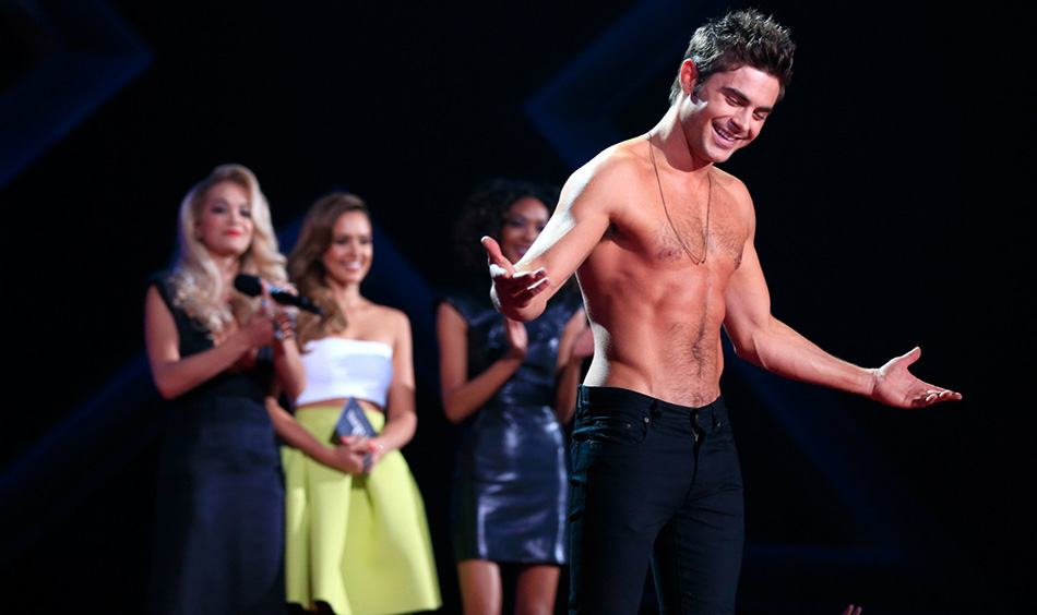 Este domingo tuvo lugar en Los Ángeles los MTV Movie Award. Conan O'Brien, presentador del programa Late Nigh de la CBS, fue el encargado de llevar esta entrega de premios. Uno de los momentos más sorprendentes de la noche lo protagonizó Zac Efron cuando subió al escenario. La actriz Rita Ora era la encargada de darle su premio al mejor momento sin camiseta en su película That Awkward Moment. La actriz no quiso entregarle solo el premio sino que le quitó la camiseta para que el actor mostrase sus abdominales.