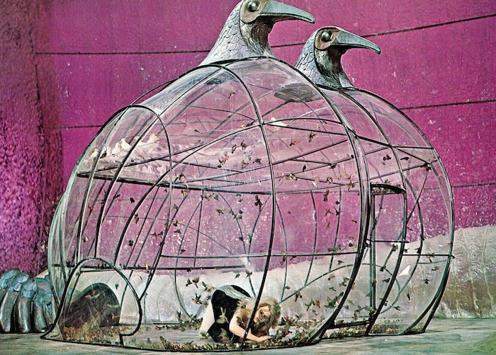 La famosa y cursi escena de la pajarera donde cae atrapada Barbarella y casi muere de la forma más poética: a picotazos. (Ver vídeo de la secuencia de los periquitos malvados)