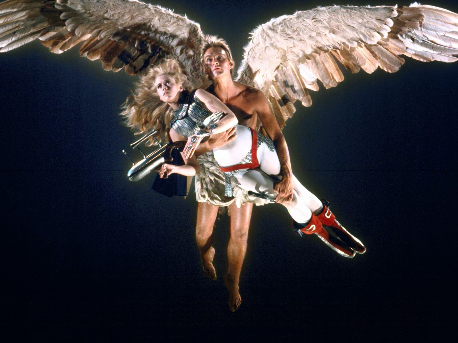 Impresionante escena kitsch en la que el ángel melancólico salva a Barbarella llevándosela por el aire.
