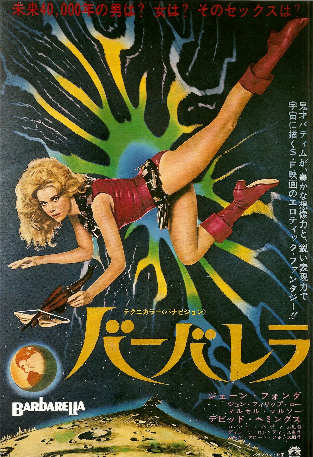 Cartel japonés con Barbarella volando ingrávida en el espacio exterior sin temor a las explosiones de estrellas supernovas realmente psicodélicas.