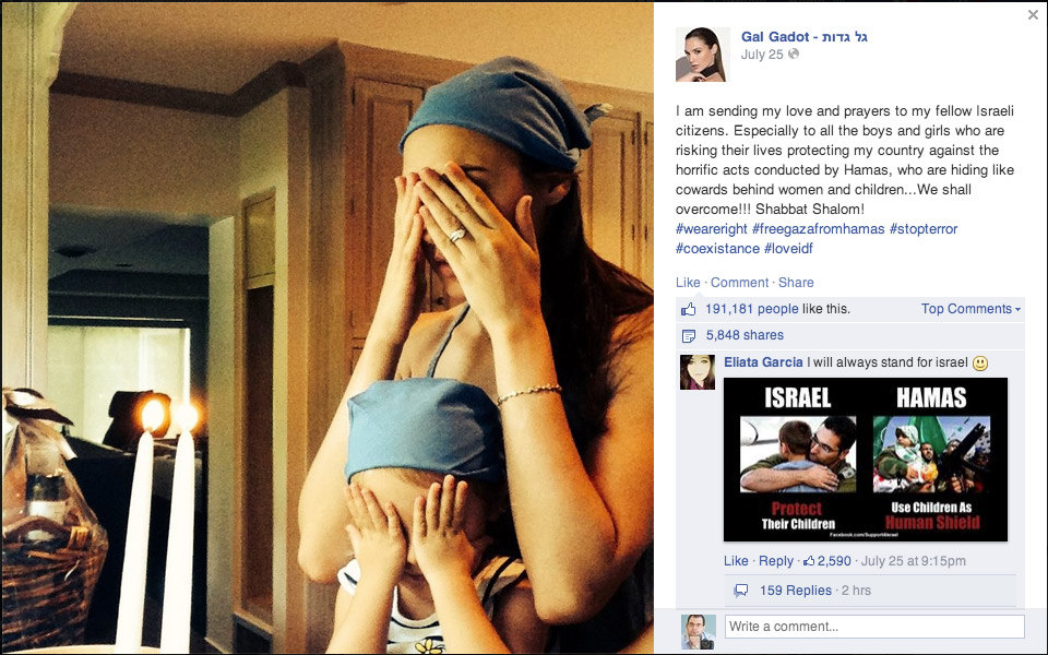 La actriz israelí Gal Gadot ha dado un salto en su carrera en Hollywood al ser elegida para ser la Wonder Woman de las nuevas entregas de las películas de Marvel, pero eso no ha hecho que cambie su forma de pensar y hace poco animaba a los soldados de Israel en su lucha contra Hamás.