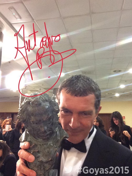 El primer tuit de Antonio Banderas ha sido un selfie on el director Pedro Almodóvar y el Goya de Honor del que le hicieron entrega.