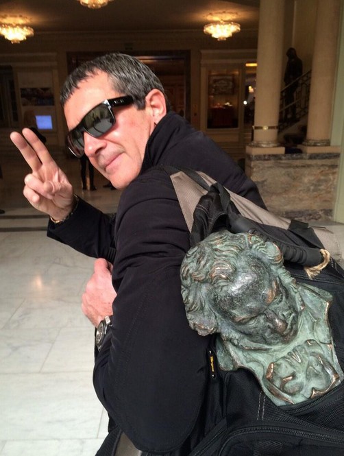 La última foto publicada por Banderas fue su llegada al hotel con el Goya de Honor saliendo de su mochila.
