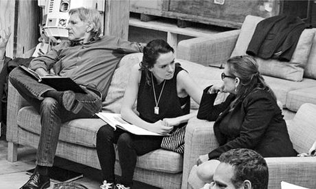 Una de las primeras imágenes oficiales difundidas de Star Wars, que muestra una de las primeras reuniones de trabajo del equipo. En la imagen, Daisy junto a Harrison Ford y Carrie Fisher.