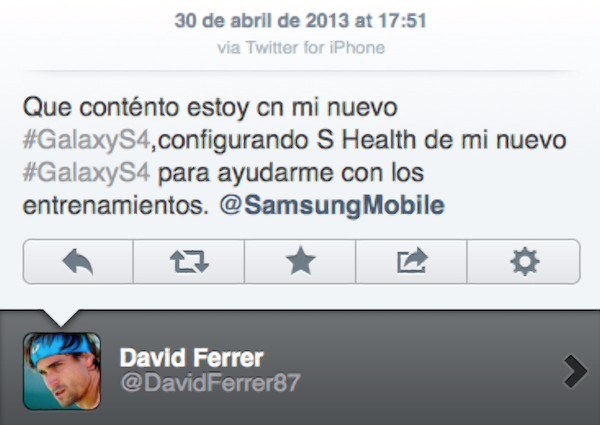 Este era el mensaje que compartió el tenista David Ferrer con sus, por aquel entonces, casi de 370.000 seguidores en Twitter. El deportista había firmado un contrato para ser la imagen de Samsung, por lo que cabe suponer que este tuit formaba parte de una campaña publicitaria. Sin embargo, el valenciano se despistó y se olvidó que estaba enviando el mensaje desde un terminal de Apple.