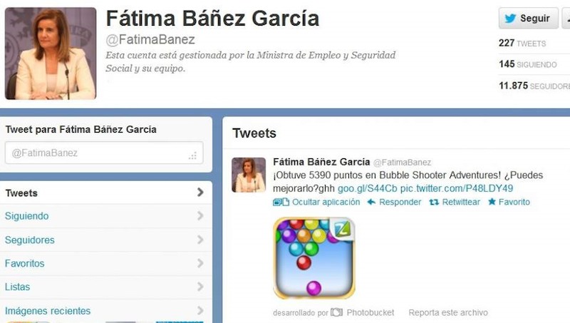 Lo mismo le pasó a la ministra Fátima Báñez, en esta ocasión con el juego Bubble Shooter Adventures. Ella misma aclaró el por qué de aquel tuit sin sentido: "Una travesura infantil ha provocado que se genere el mensaje de forma automática en esta cuenta", aunque, como era de esperar, también fue muy comentado.