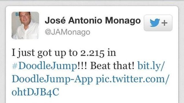 El expresidente de la Junta de Extremadura, entonces asiduo usuario de Twitter, dio de baja su cuenta en la citada red social después de que en ella se publicara un mensaje automático que se genera tras lograr un récord en el conocido videojuego Doodle Jump. El mensaje no era para tanto, pero la anécdota generó numerosos mensajes irónicos.