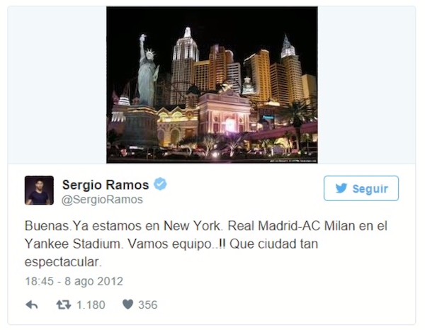 Las meteduras de pata de Sergio Ramos en Twitter no son ninguna novedad. Durante una gira del Real Madrid por Estados Unidos, el futbolista tuiteó una foto diciendo que el equipo se encontraba en Nueva York, suponemos, por la estatua de la libertad que aparece en la foto. Sin embargo, donde realmente estaba, era en Las Vegas.