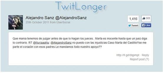 Allá por 2011, una seguidora de Alejandro Sanz le pedía que divulgara su mensaje de apoyo a la familia de Marta del Castillo. Él, de buena fe, escribió este comentarió y la red empezó a arder. El cantante había confundido a Marta del Castillo con la atleta Marta Domínguez.