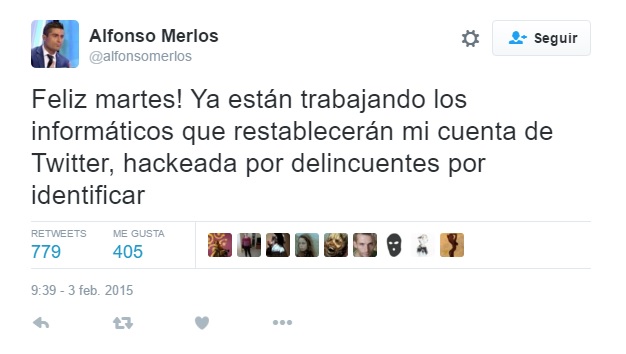 Alfonso Merlos se convirtió en trending topic en Twitter después de que, según el propio periodista, "delincuentes por identificar" hackearan su cuenta y marcaran como 'favorito' un comentario con la fotografía de un pene. La imagen iba acompañada del siguiente pie de foto: "Cada vez me convenzo más de que tienes una de las vergas más gruesas del porno! Lejos!". El periodista dejó este tuit para aclarar lo sucedido.