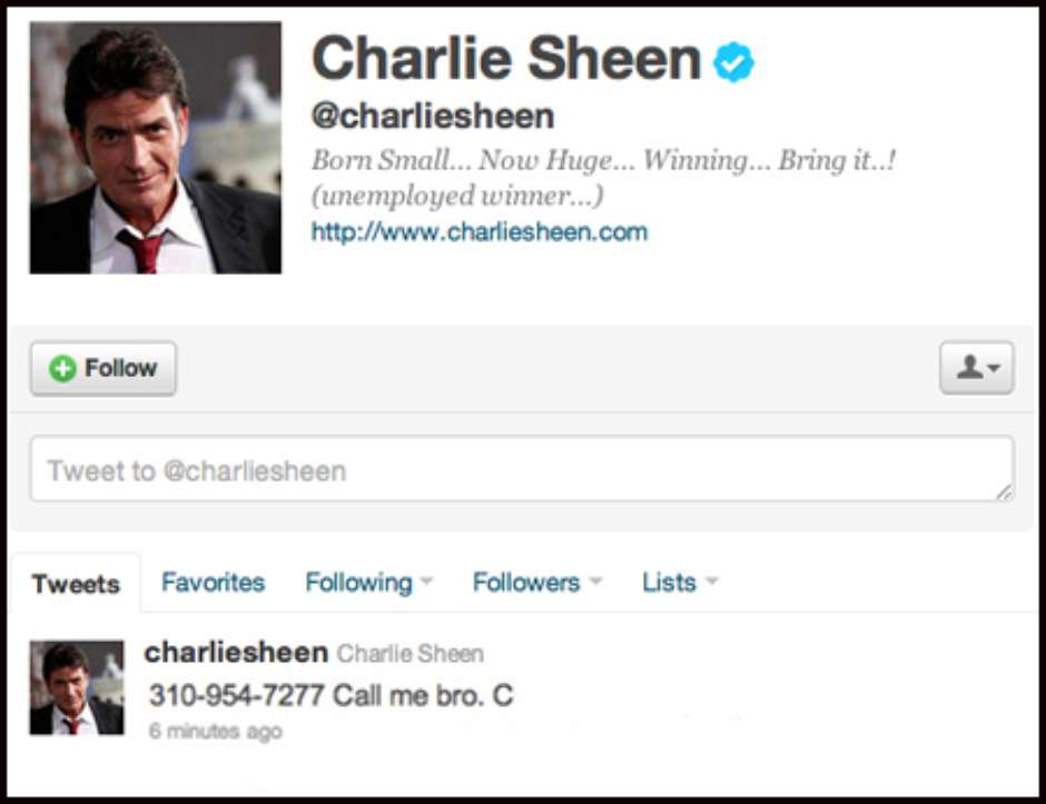 Un caso muy parecido fue el del polémico actor Charlie Sheen publicó su número de teléfono personal por error en un tuit. Se vio obligado a cambiar de número porque su teléfono no dejaba de recibir mensajes de sus seguidores.