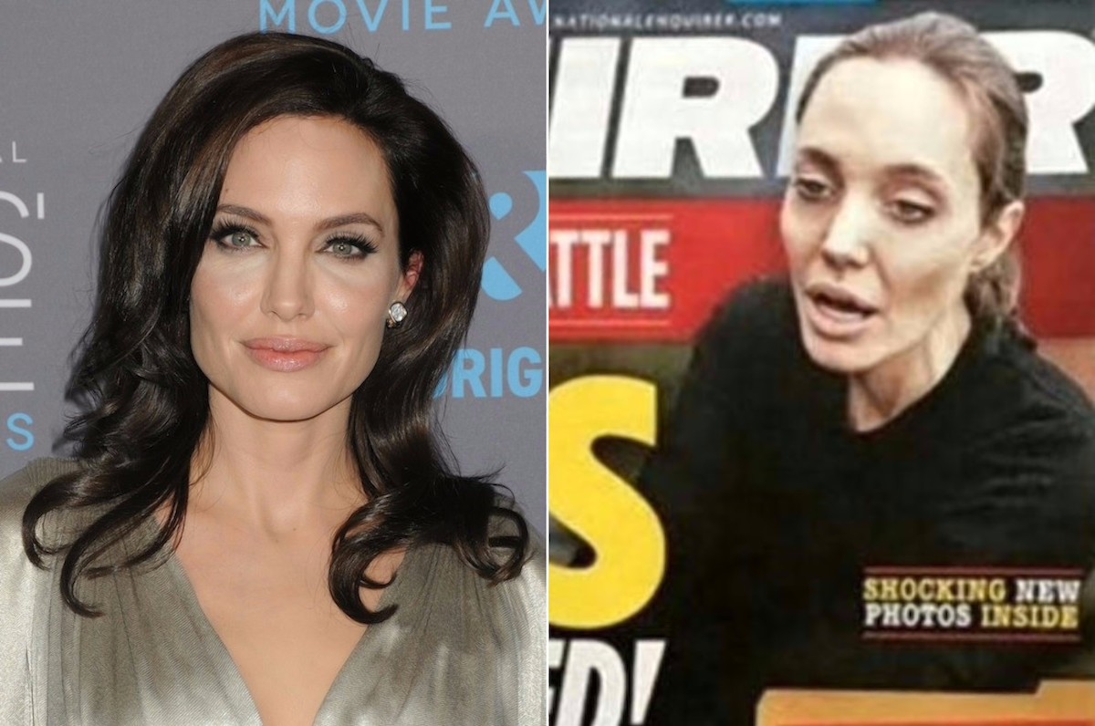 La actriz siempre ha sido considerada una de las más bellas del panorama hollywoodiense y, aunque siempre se ha mantenido muy delgada, la última portada de The National Enquirer publicó una imagen de una Angelina muy desmejorada y aseguró que fue ingresada por pesar tan sólo 35 kg.
