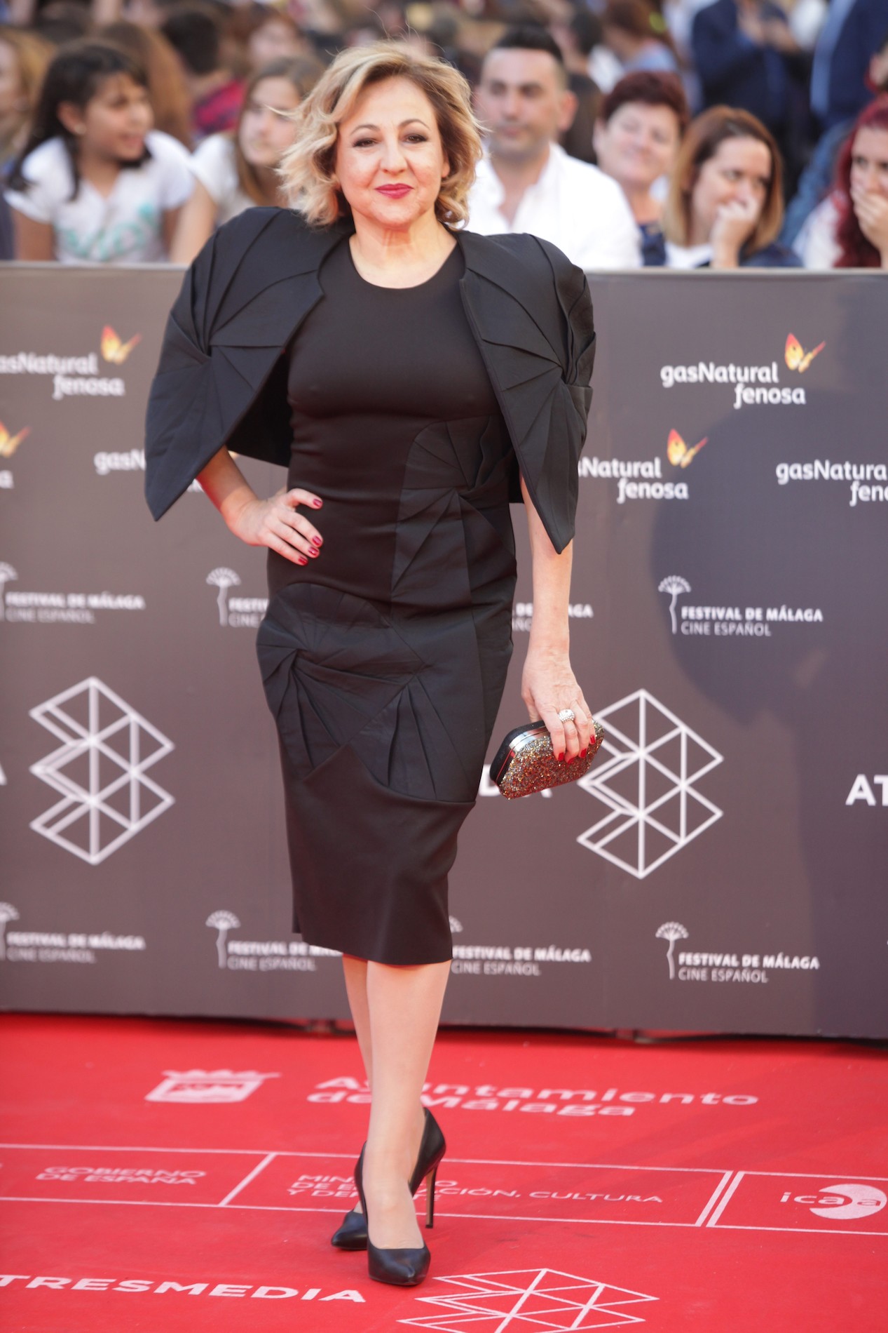Carmen Machi, con vestido negro de Amaya Arzuaga con volumen en las hombreras.