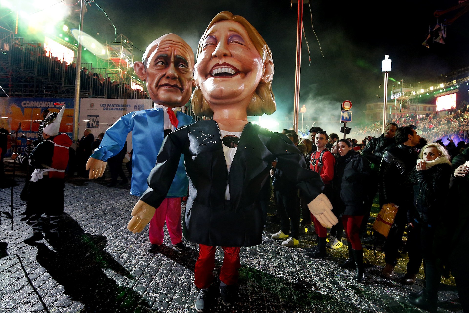 El republicano Alain Juppe y la líder del Frente Nacional, Marine Le Pen, desfilan entre la multitud por las calles iluminadas de Niza.