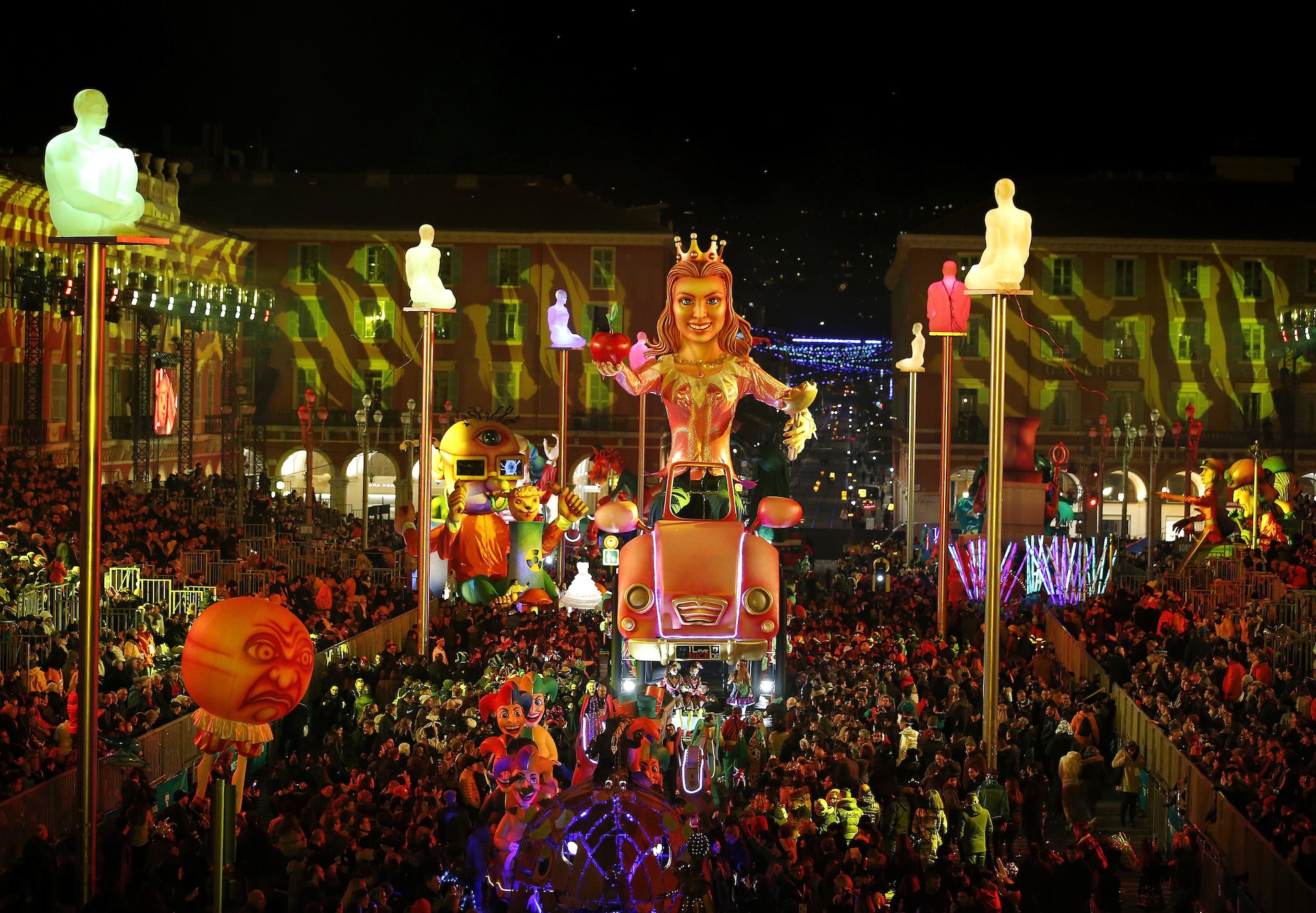 Multitud de figuras alegóricas participan en la cabalgata nocturna de Niza, donde las calles quedan iluminadas por más de 100.000 bombillas pintadas a mano.