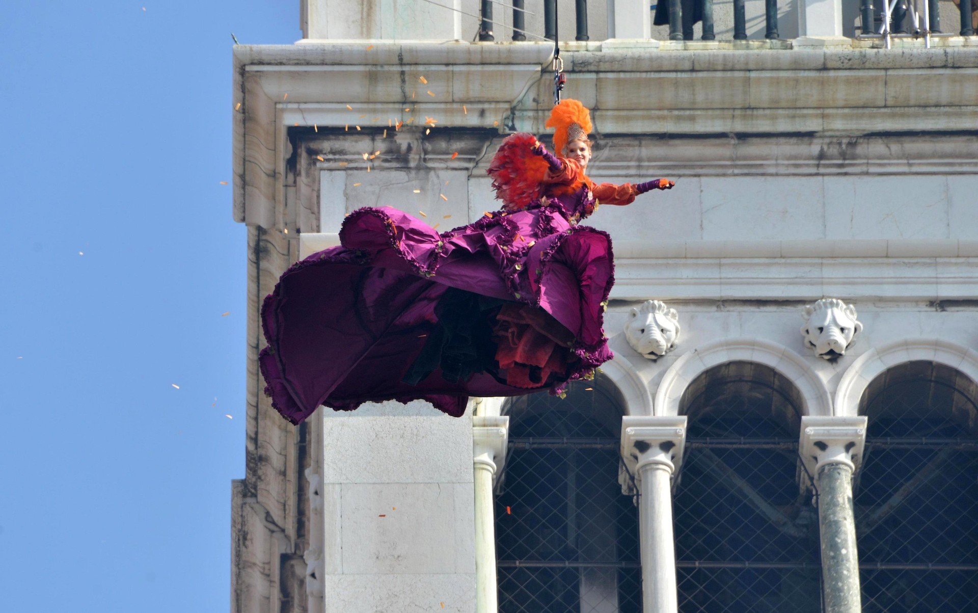 El tradicional "Vuelo del Ángel" marca la inauguración oficial de las celebraciones de la Plaza de San Marcos en el Carnaval de Venecia.