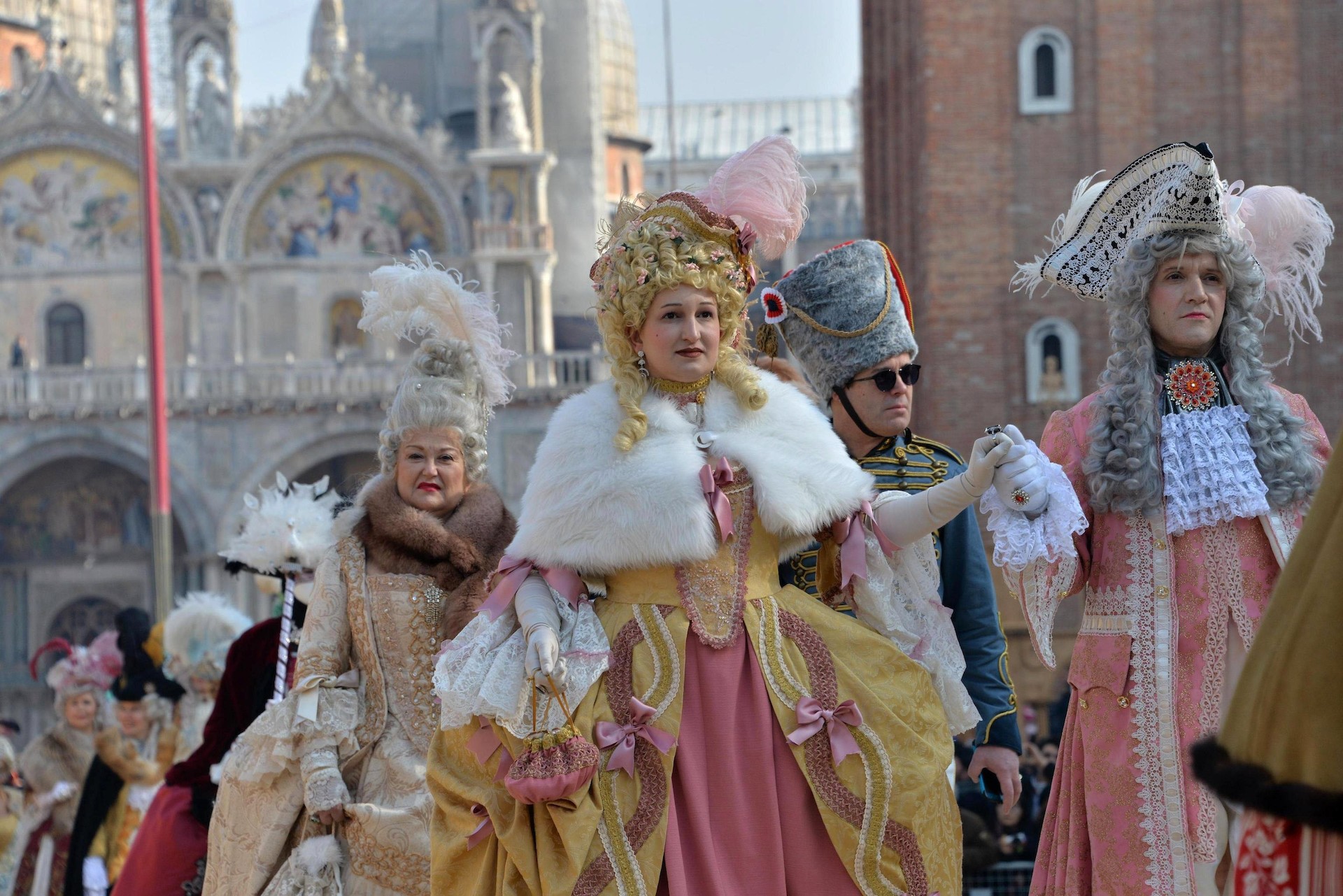 Los trajes de época ostentosos recuerdan la costumbre de la nobleza veneciana, que aprovechaba el carnaval para mezclarse con el pueblo.