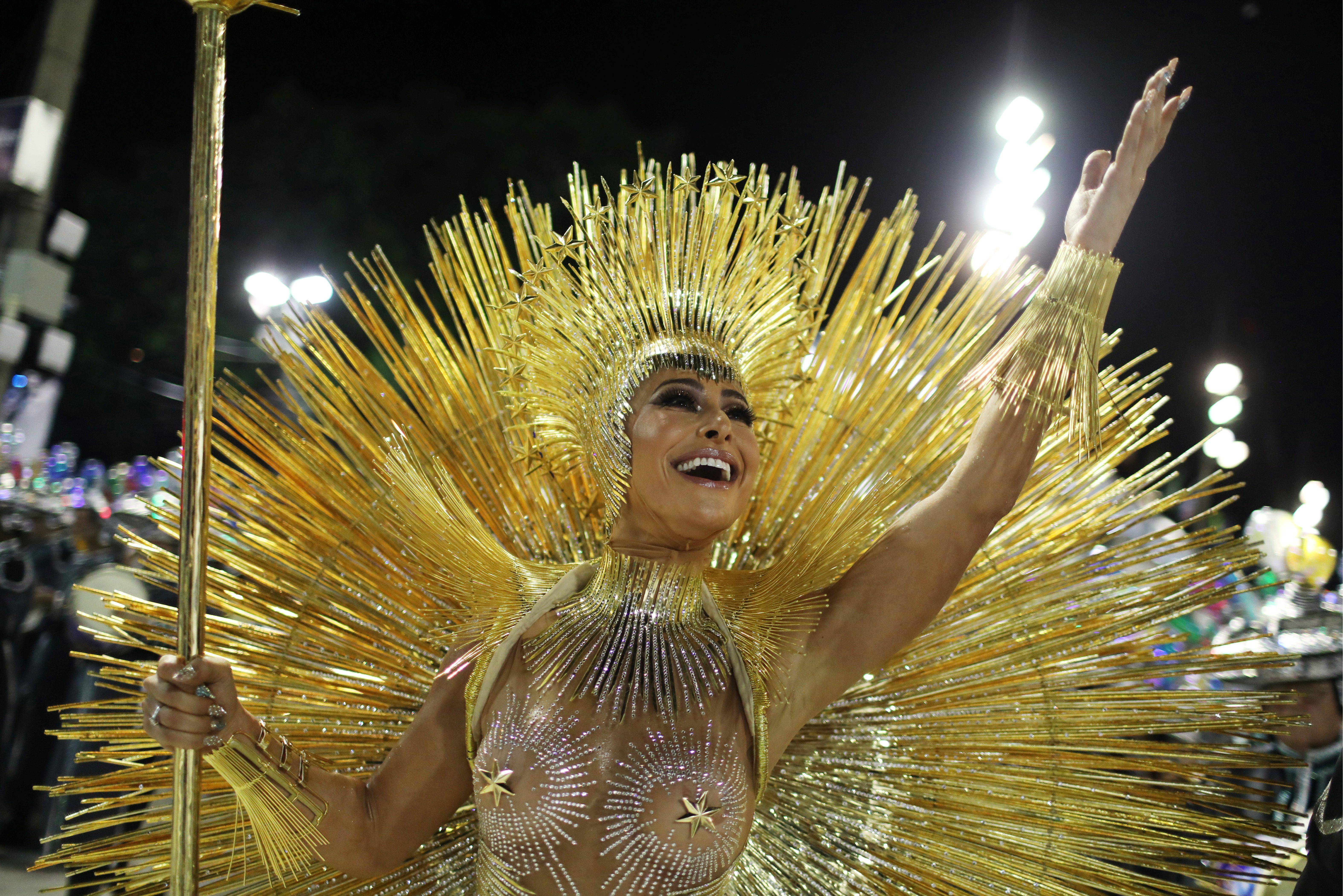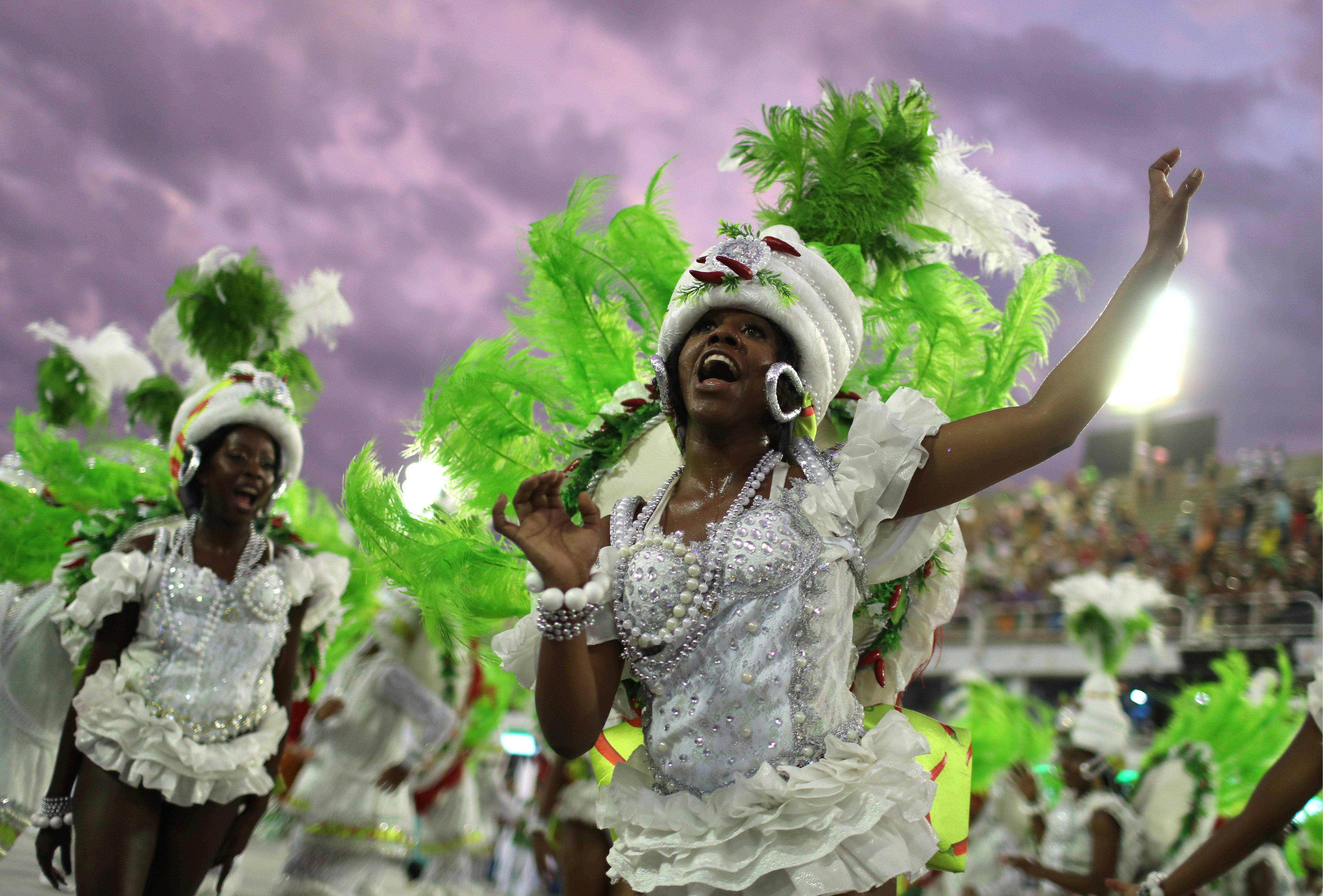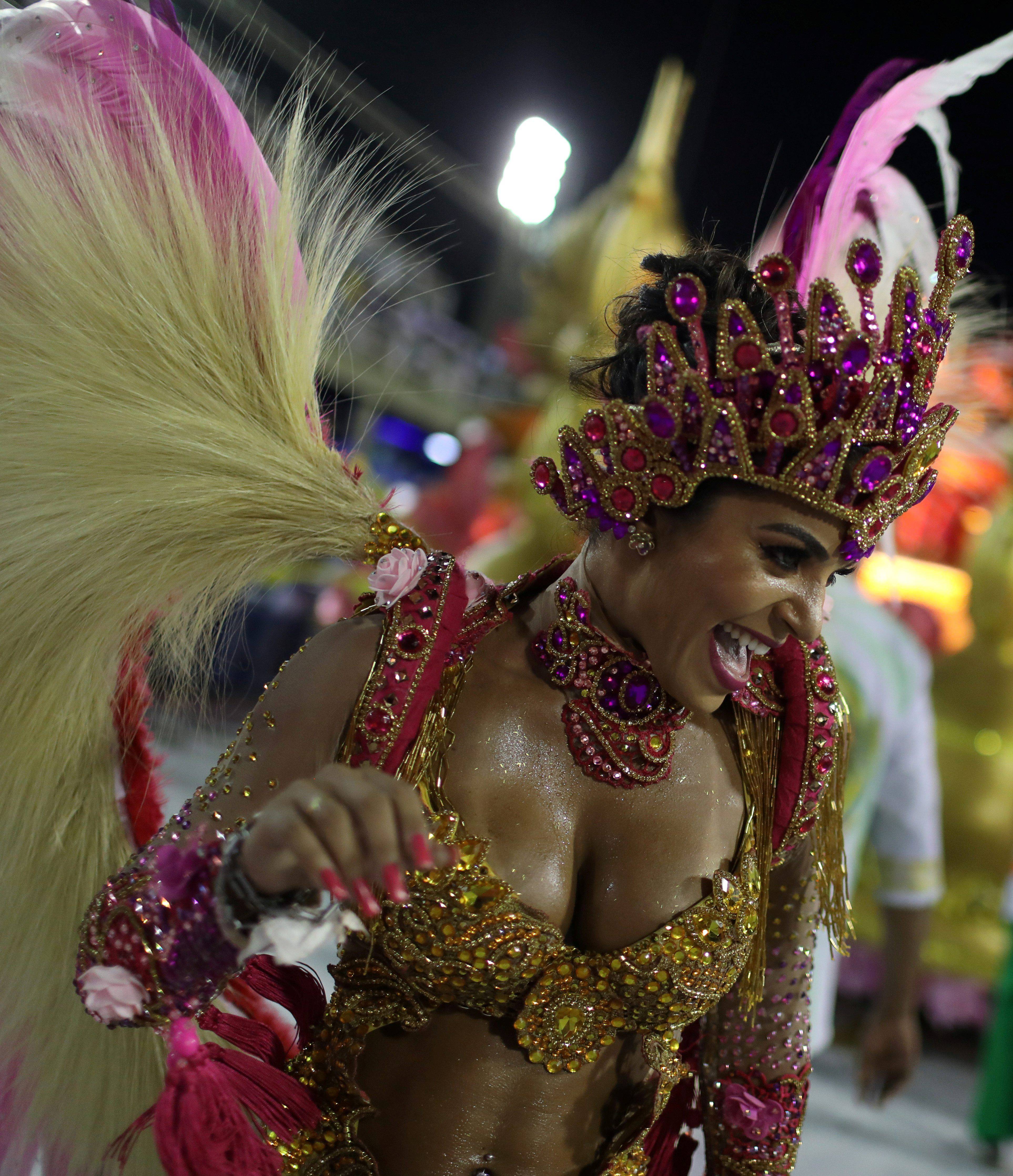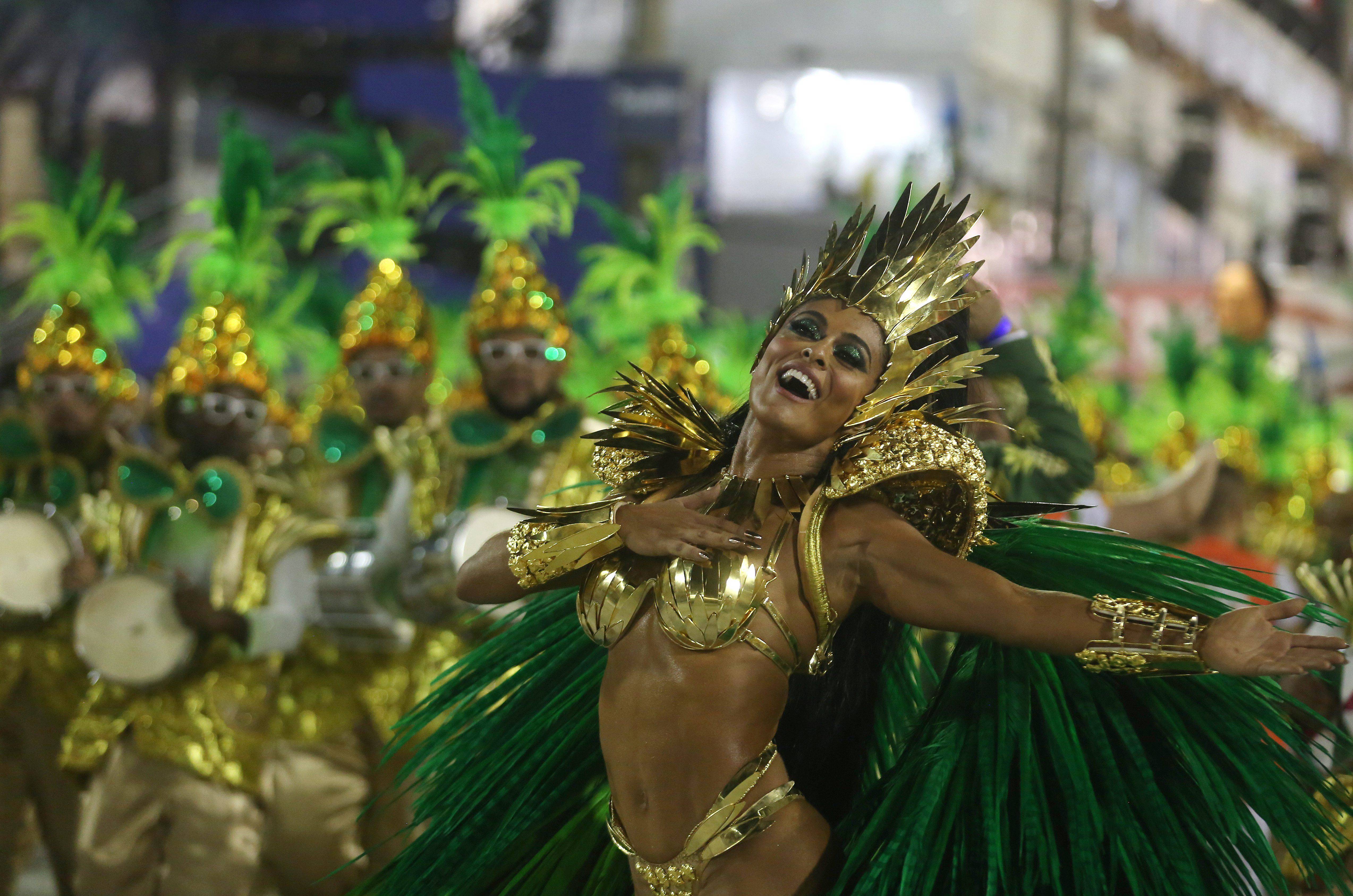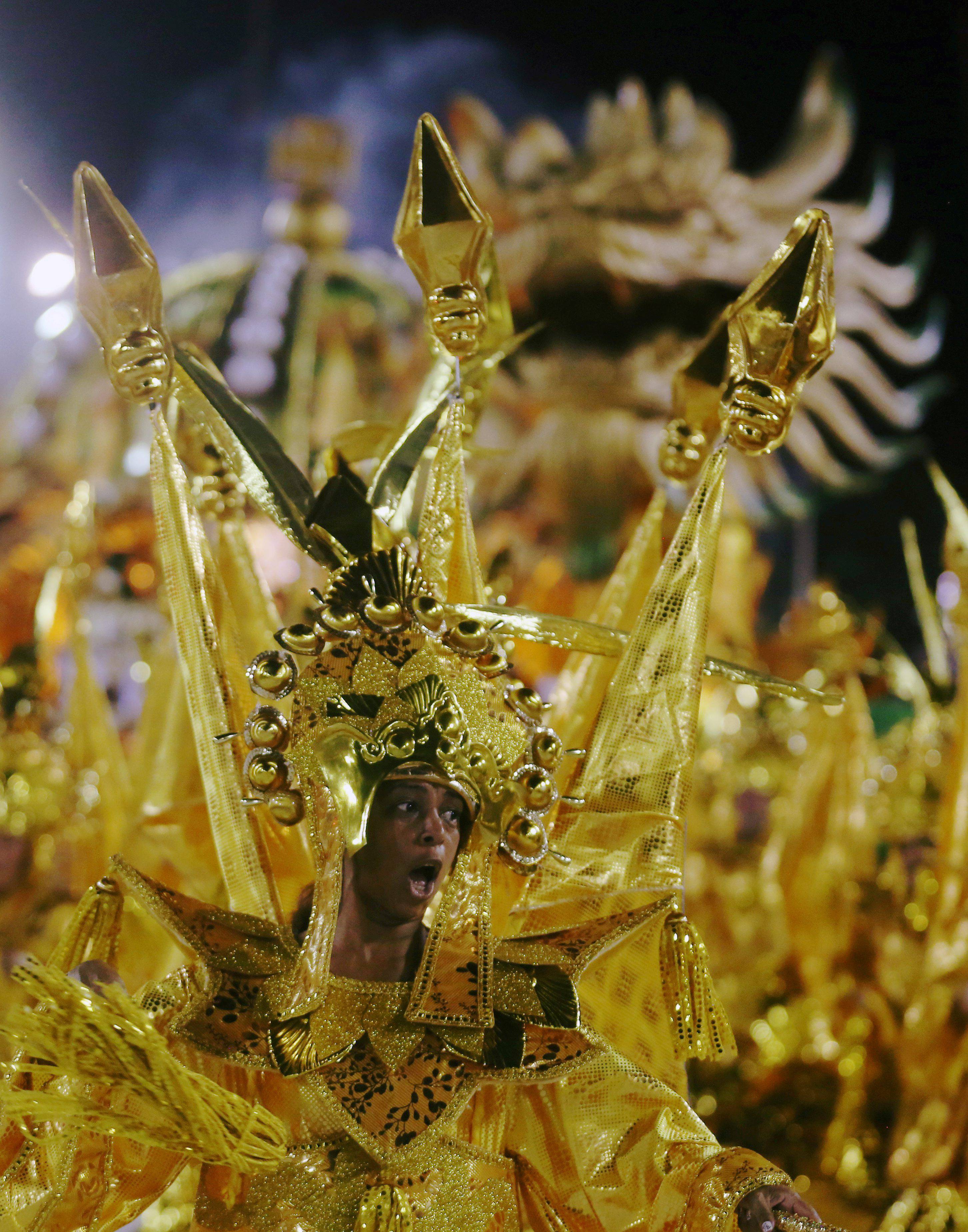 Un miembro de la escuela de samba Imperio Serrano durante la primera noche del desfile de Carnaval en el Sambódromo.