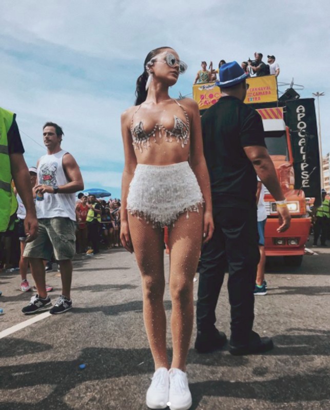 La actriz y modelo brasileña vive estos días una auténtica fiesta con el resto de compatriotas. Con un minúsculo sujetador de pedrería, culotte a juego y enormes gafas de sol, Bruna Marquezine bailó y disfrutó del carnaval más espectacular del mundo