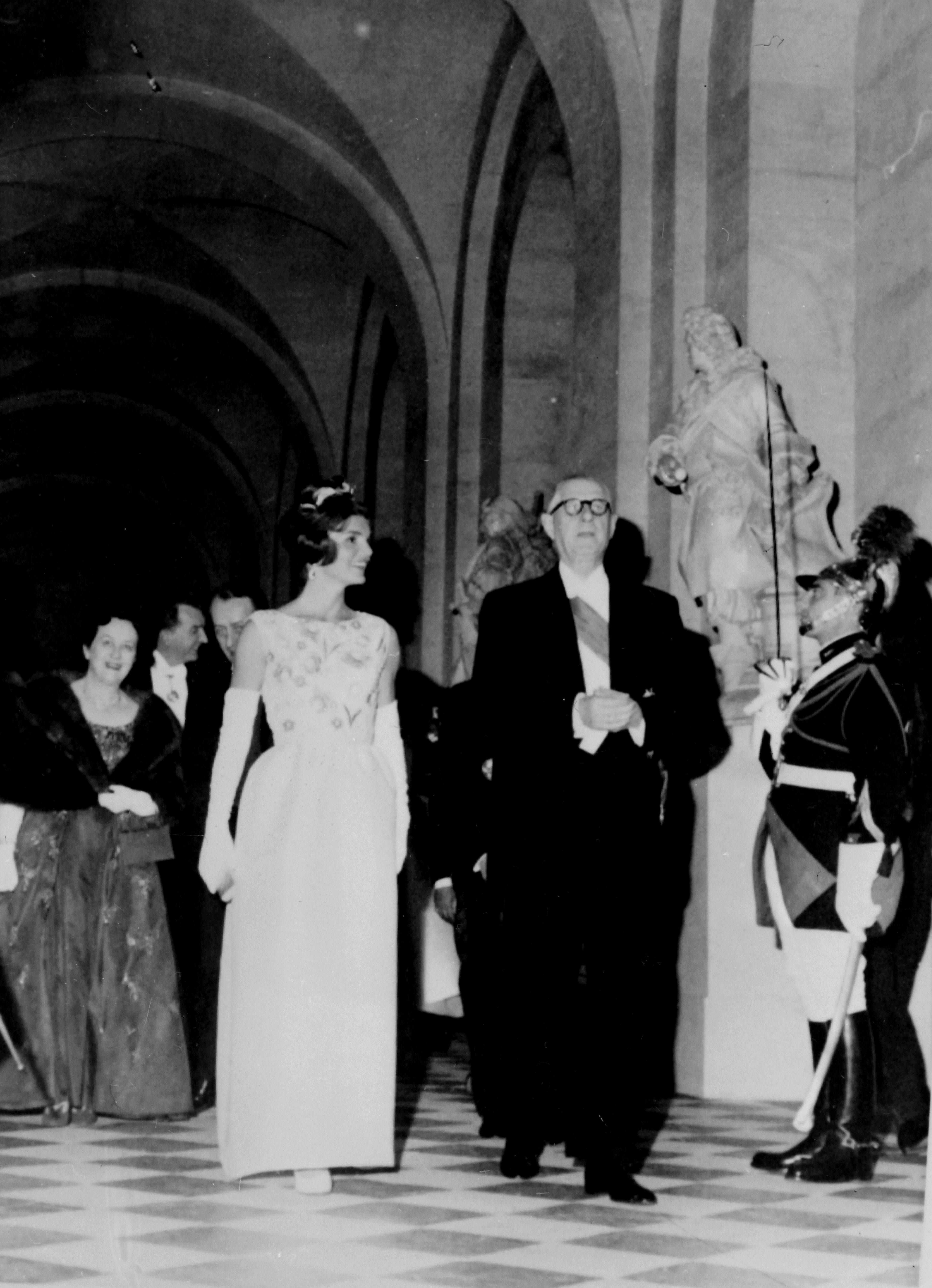 Escoltada por el presidente francés Charles de Gaulle, Jackie Kennedy se dirigió a una cena celebrada en el Palacio de Versalles. La primera dama rindió homenaje a la nación anfitriona vistiendo un vestido de noche de seda color marfil con corpiño bordado por Hubert de Givenchy, y guantes blancos de cuerpo entero.