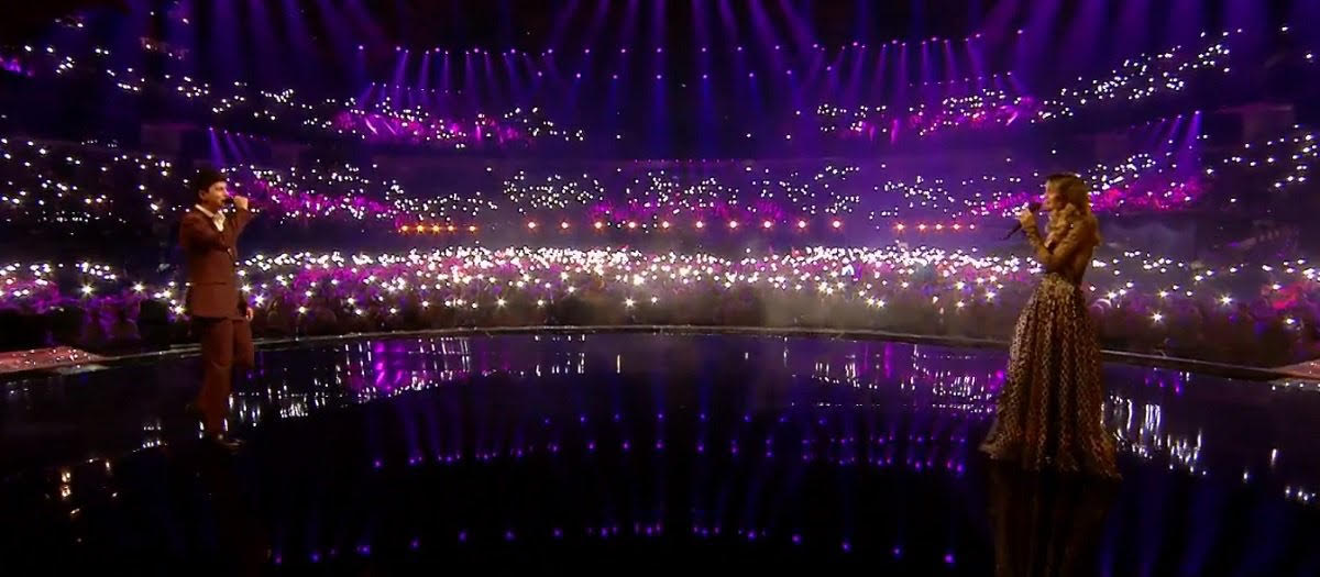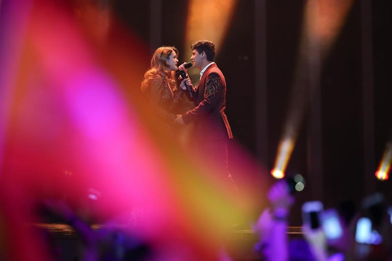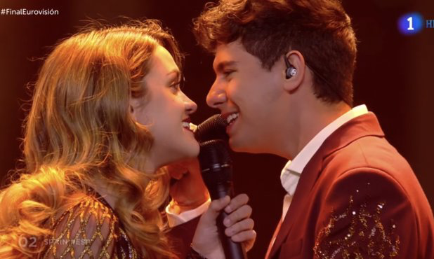 Alfred y Amaia cantan mientras el público agita banderas de España.