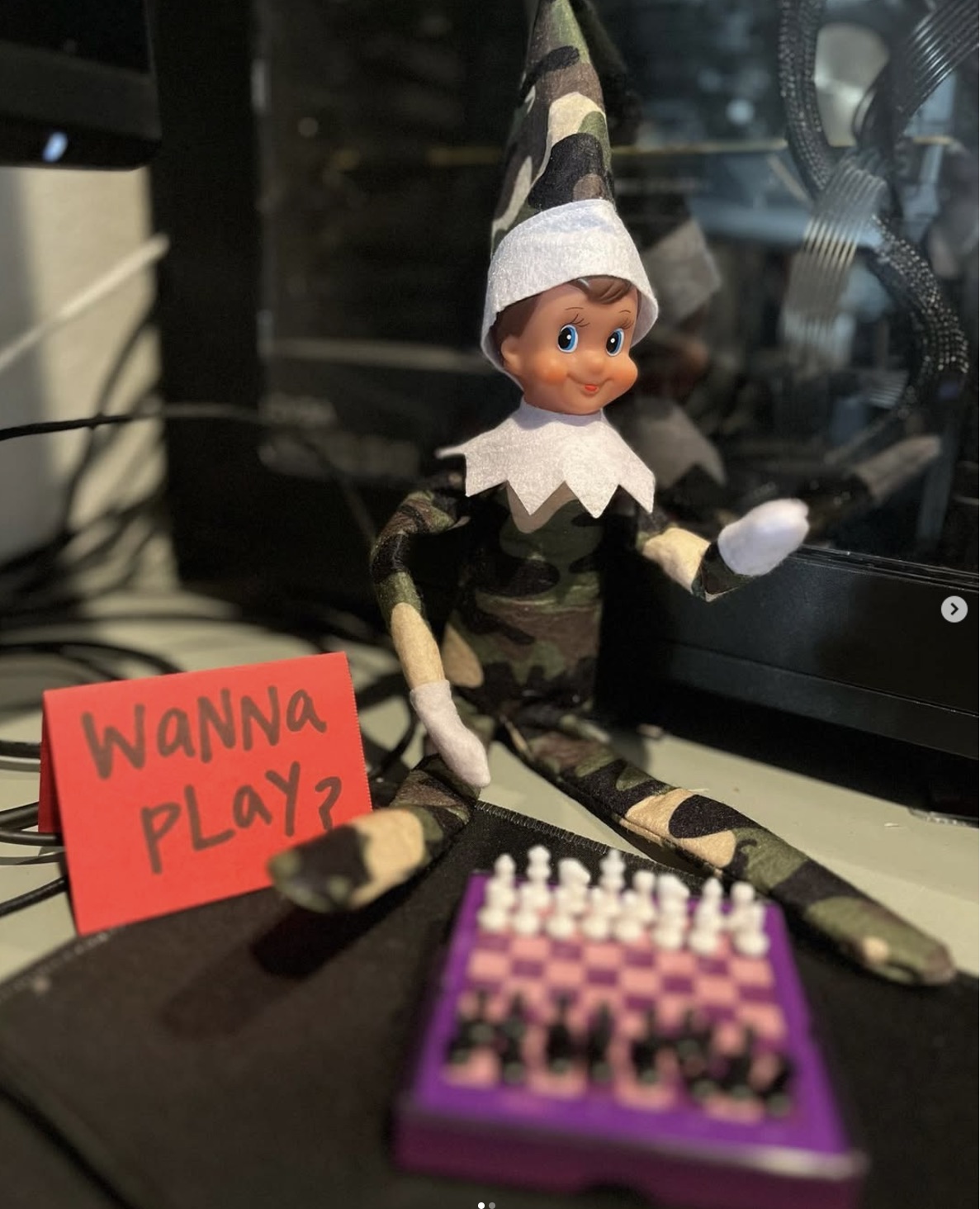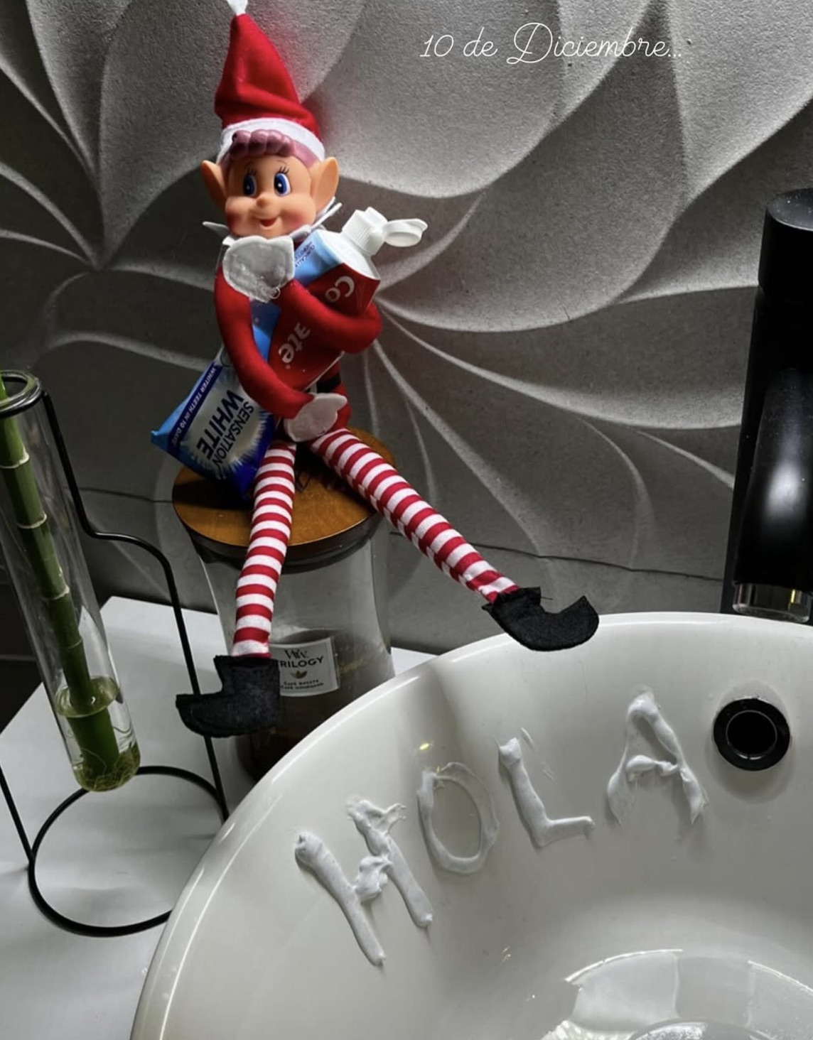 El elfo travieso se ha colocado estratégicamente sobre el rollo de papel higiénico, como si fuera su propio tobogán.