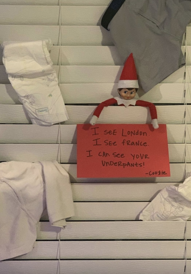 En este caso, el elfo travieso ha robado la ropa interior y los pañales de los más pequeños, dejando un rastro mientras escapa por la persiana.