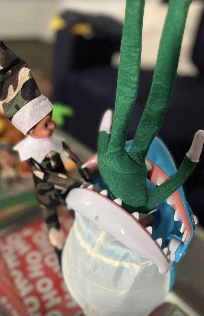 Dos elfos traviesos están jugando con los juguetes de los más pequeños, y uno de ellos se ha quedado atrapado en la boca de un tiburón.