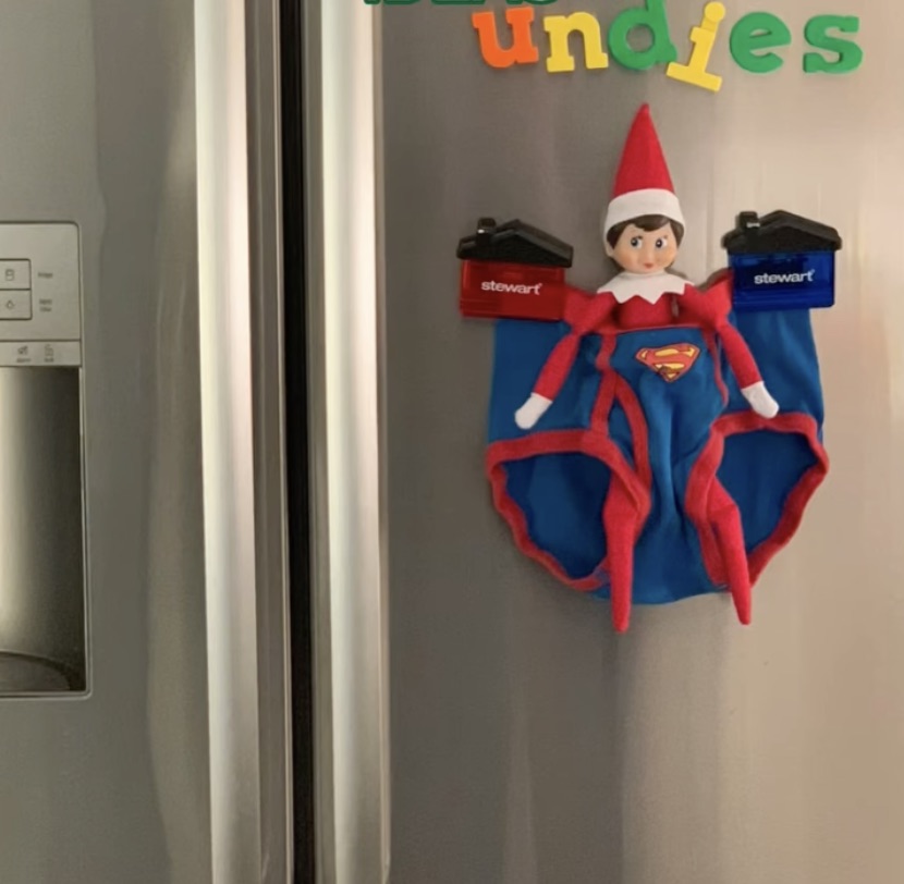El elfo travieso se ha quedado enganchado en un calzoncillo y ha terminado pegado a la nevera.