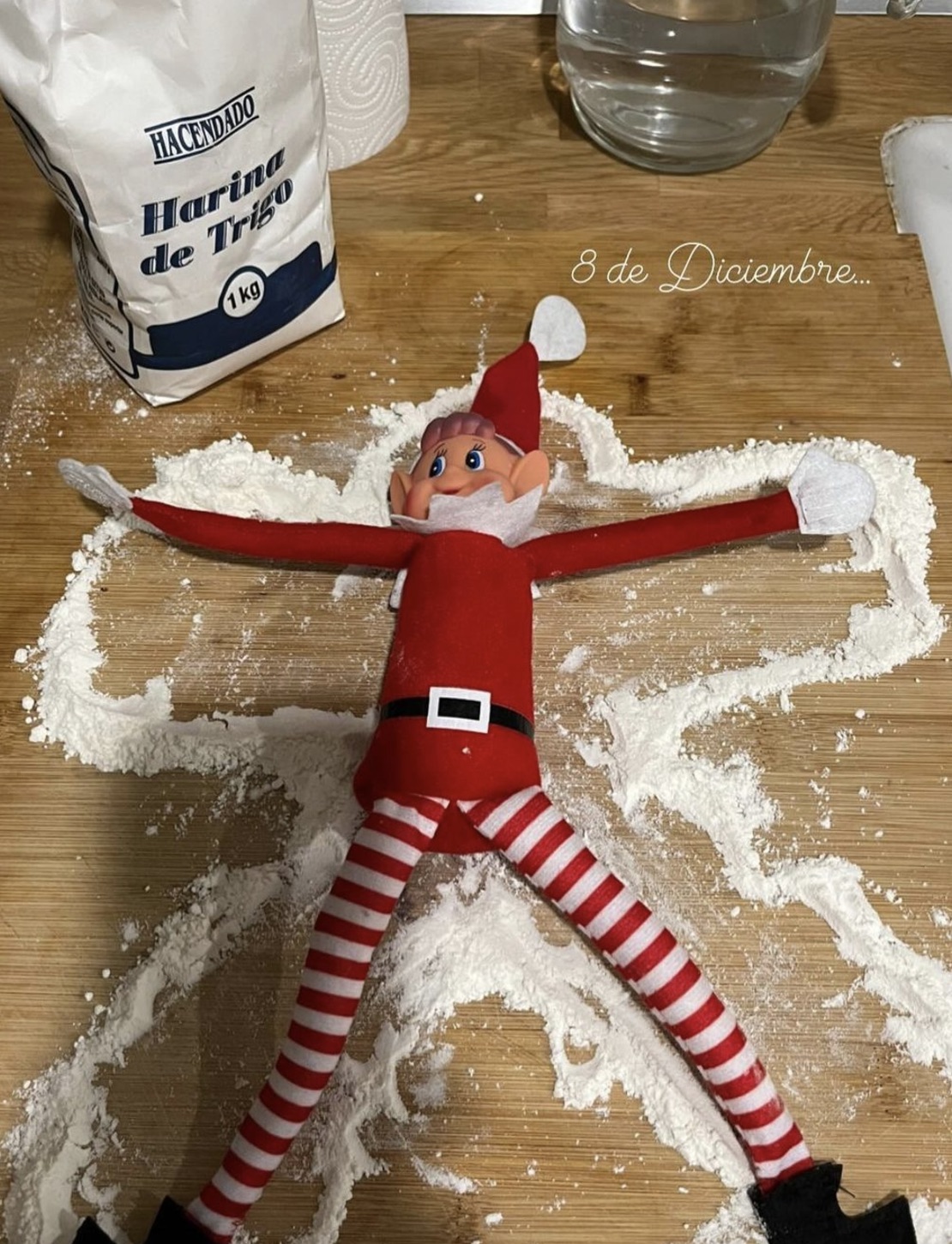El elfo travieso aparece en la cocina, jugando con la harina y haciendo su propio “ángel en la nieve” sobre la mesa.