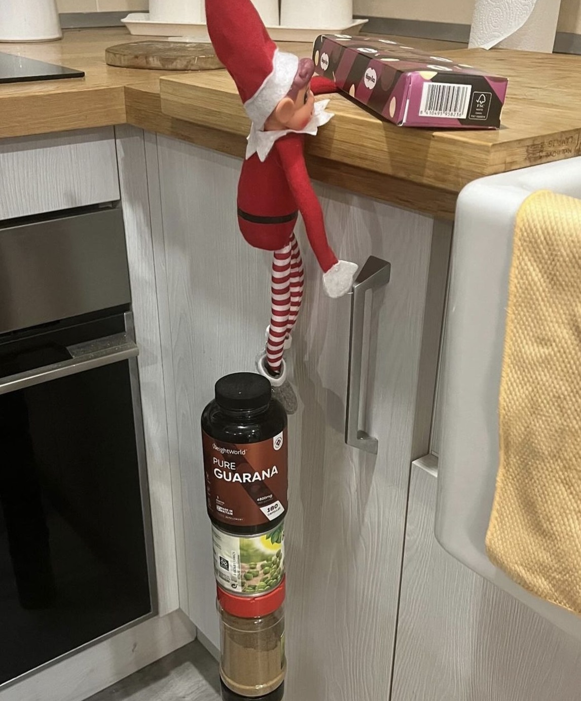 El elfo travieso ha construido una escalera con los botes de la cocina para trepar a la encimera y robar un dulce.