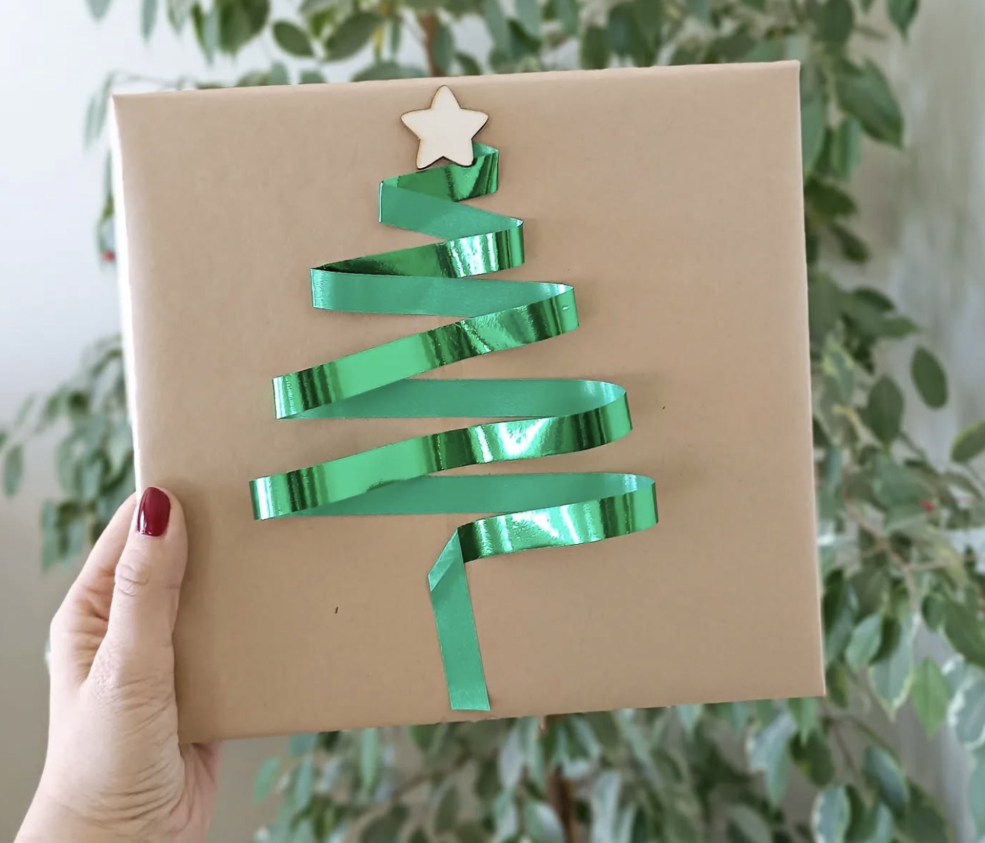 En esta opción, solo necesitas una cinta de color verde y algún detalle para colocar en la punta del árbol.