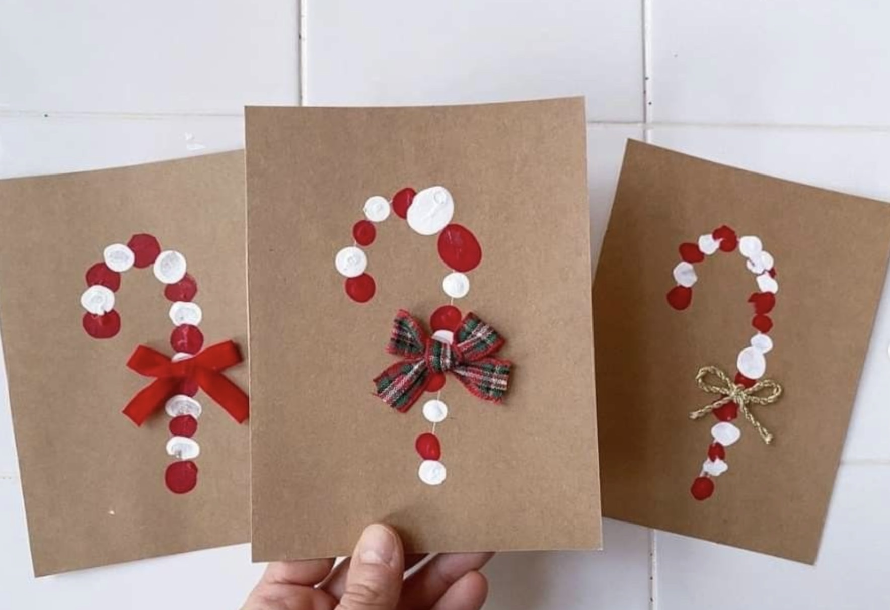 Con pintura blanca y roja, y usando las huellas de tus dedos, puedes crear estos sencillos bastones navideños. Es una idea perfecta para hacer con los más pequeños.