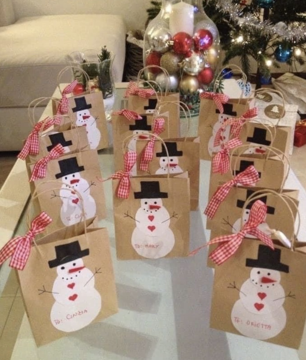 La última idea que te presentamos es sencilla y puede transformar una simple bolsa de color marrón en una divertida estampa navideña. Puedes crear un muñeco de nieve con pintura blanca y roja, y añadir los detalles con un rotulador negro.