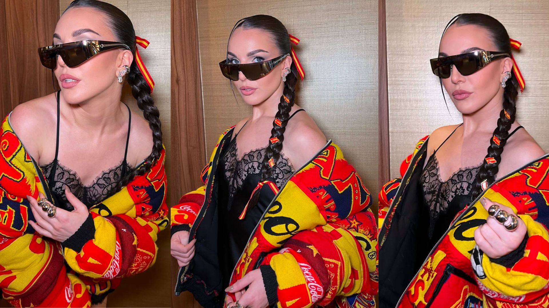 La "chupa" al más puro estilo español agrupa bufandas del país y de la La Roja. "Campeooones", canta adentrándose en el mundo deportivo. "Patriota, nacional, de mi bandera", recalca Inés, "porque también es nuestra", señala identificándose con la bandera de España. La influencer se ha declarado de izquierdas en sus redes sociales, y en ocasiones, se le ha identificado como republicana, por ello, ha querido hacer un guiño a sus polémicas vistiendo un look inspirado en España.