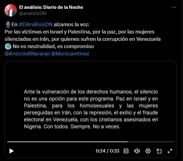 "Ante la vulneración de los derechos humanos, el silencio no es una opción para este programa. Paz en Israel y en Palestina, para los homosexuales y las mujeres perseguidas en Irán, con la represión, el exilio y el fraude electoral en Venezuela, con los cristianos asesinados en Nigeria. Con todos. Siempre. No a veces", dice el mensaje emitido por el programa de Antonio Naranjo.