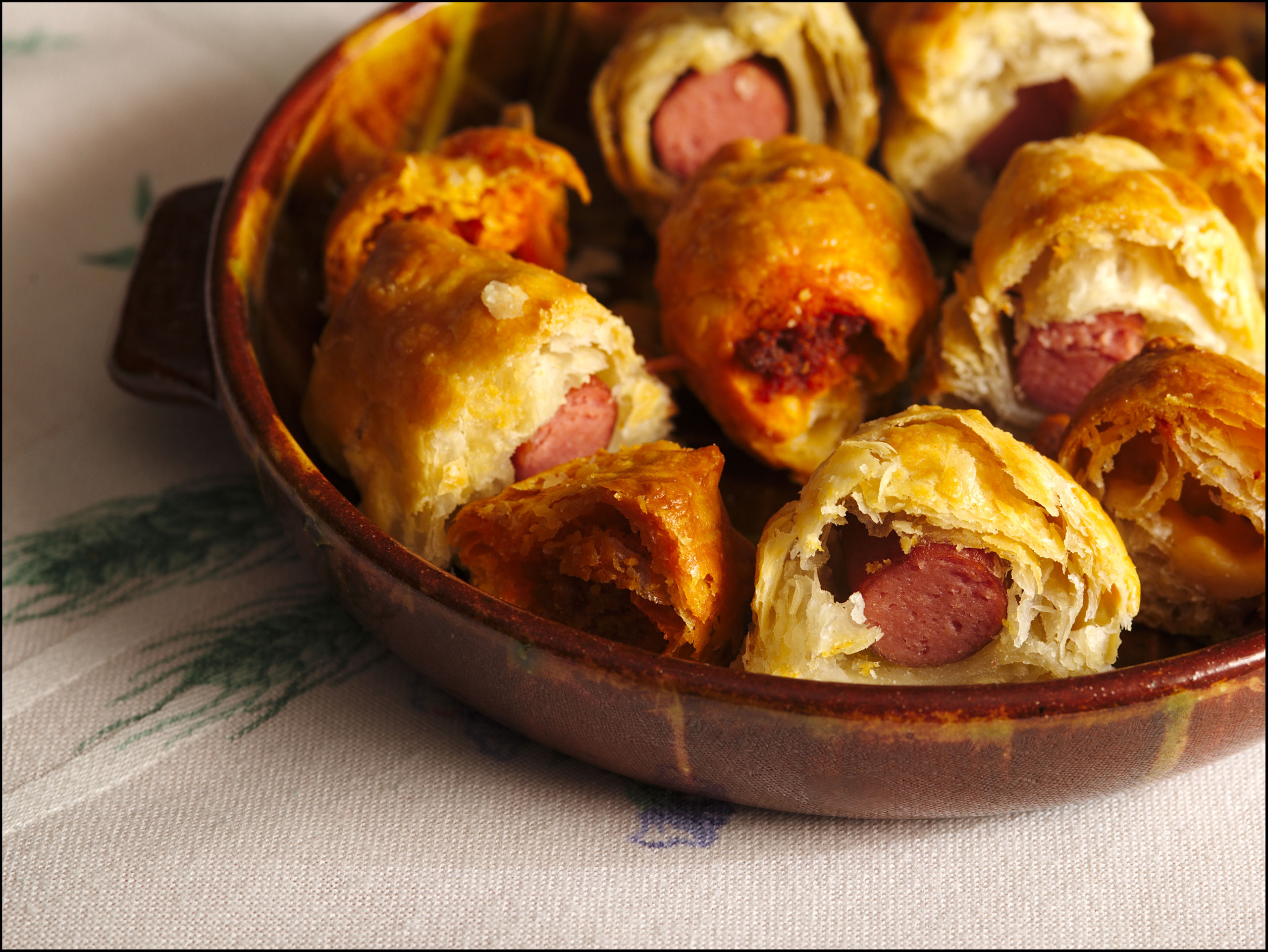 Rellenamos la masa de hojaldre, previamente estirada sobre papel vegetal en la bandeja del horno, con la masa y colocamos una loncha de queso por encima. Cerramos bien y cortamos en espiga, a continuación pintamos con huevo batido por encima para que se dore.