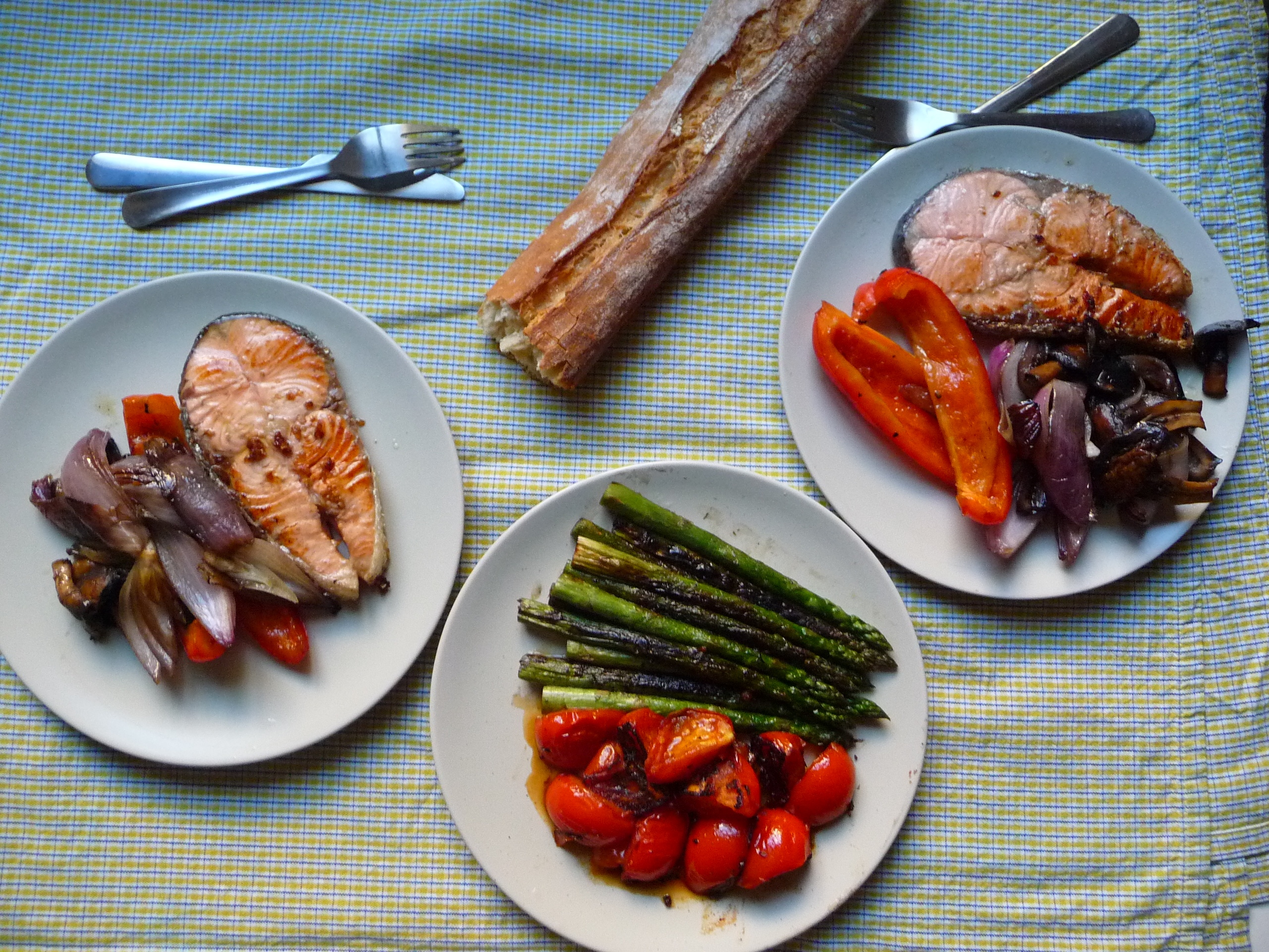 A la hora de servir primero ponemos una cama de verduras, a las que podemos añadirle patata también, y por encima el salmón. Luego simplemente queda disfrutar.