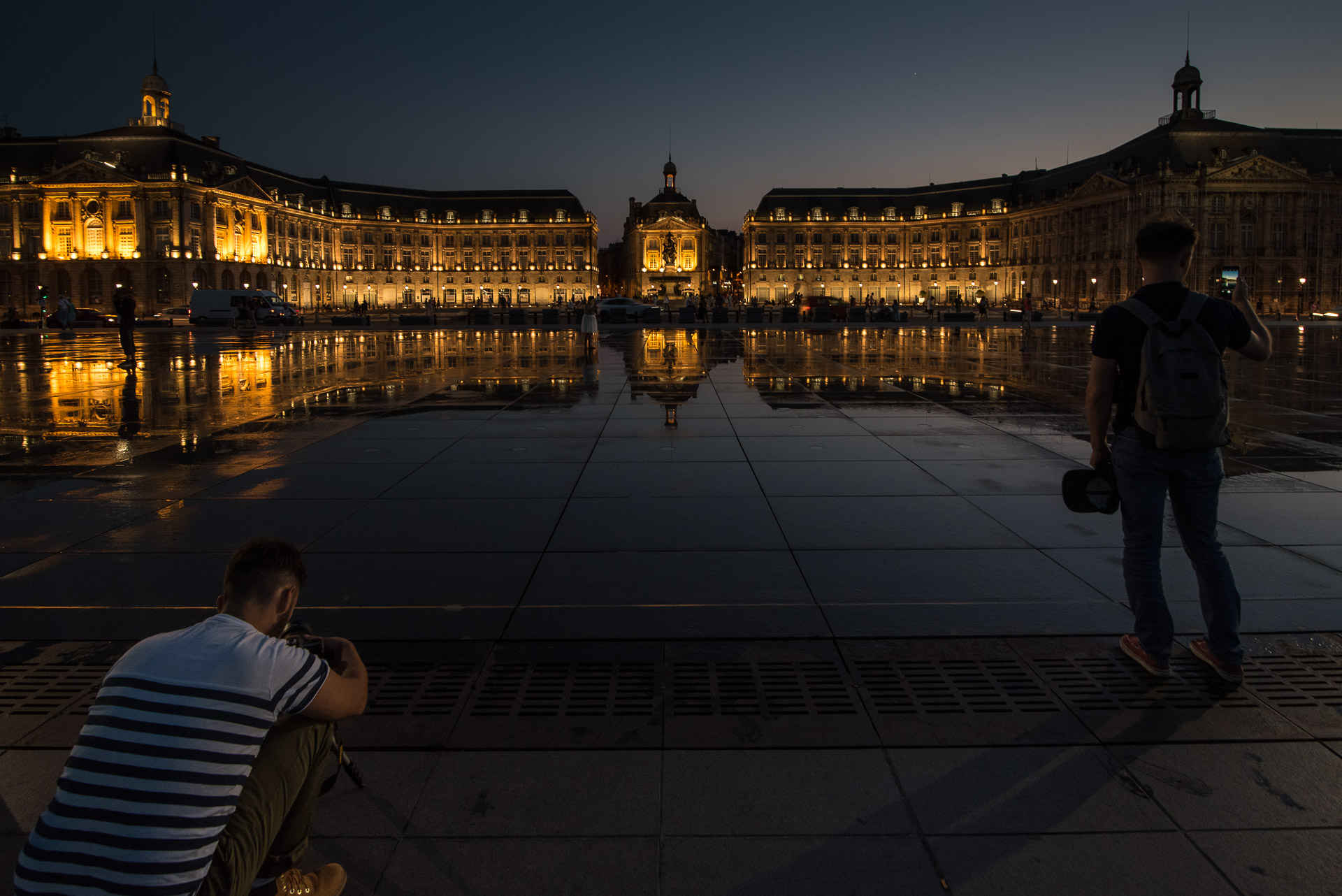 O Burdeos, quizá todavía más bella iluminada por la noche, con la increíble Plaza de la Bolsa reflejándose en el Miroir d’eau y también muchas terrazas en las que los bordeleses salen a cenar y, por supuesto, beber vino.